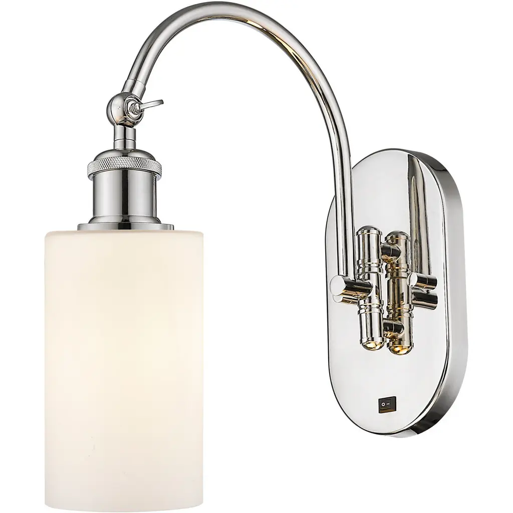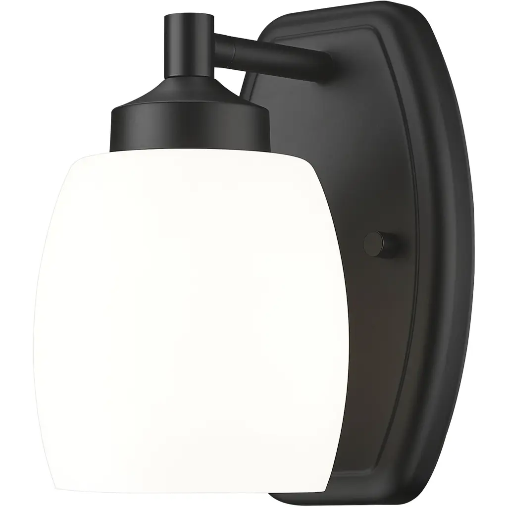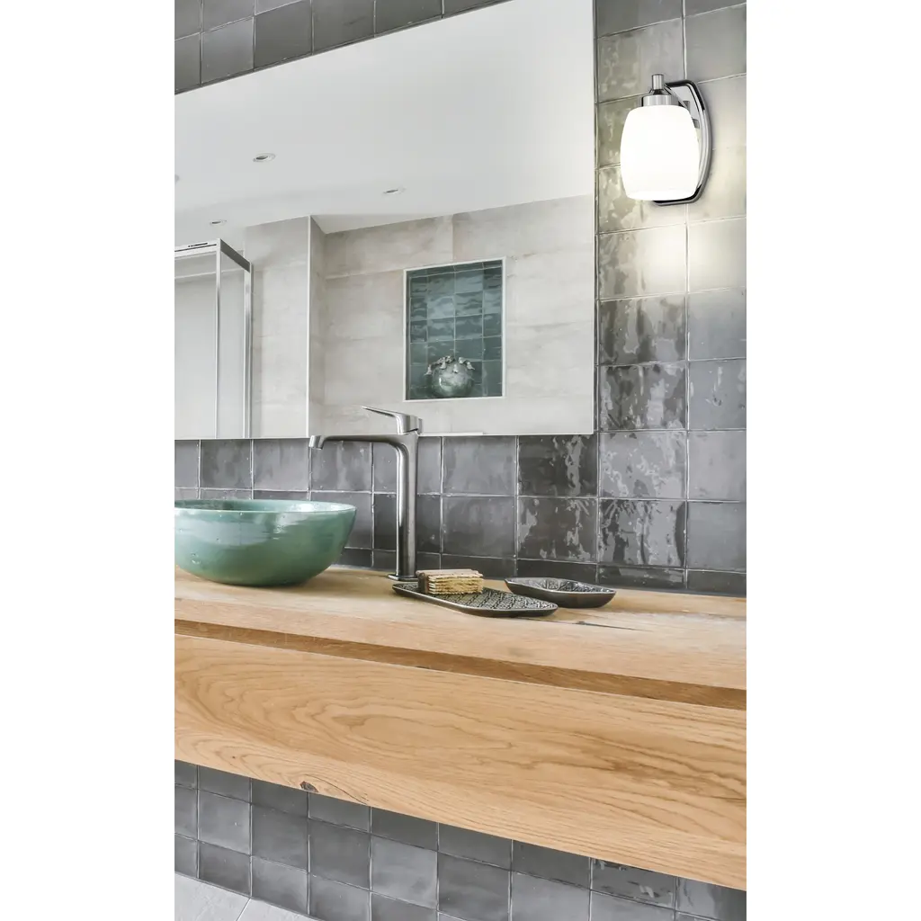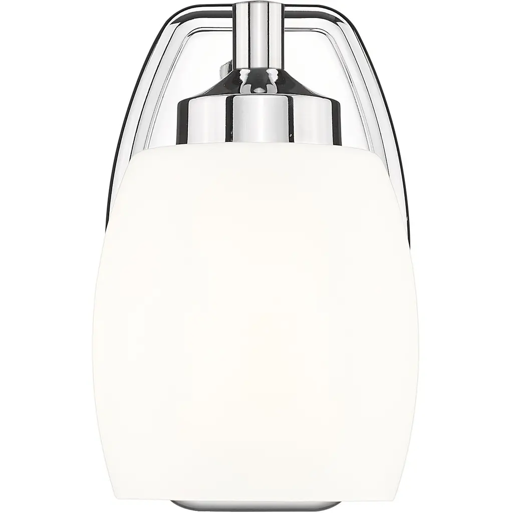 The soothing simplicity of matte opal glass contrasts beautifully with the gleaming chrome finish of a modern one-light wall sconce. Beautiful in a bath or living area, it showcases simple, smooth curves in both its wall plate and shade.