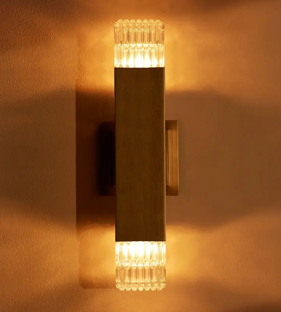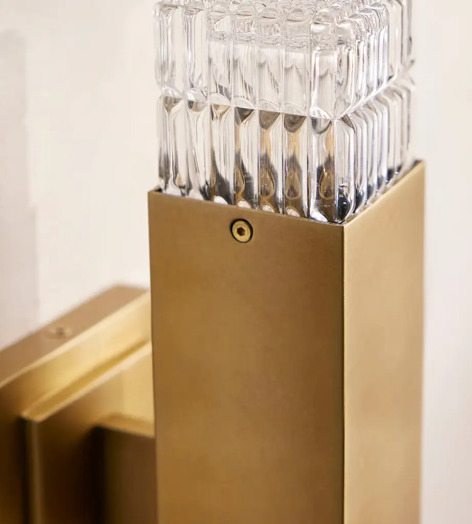 Fitted with up and downlight diffusers, the frame of this bathroom-safe wall sconce is plated with antiqued brass. Taking inspiration from the interiors of Soho House Rome, the Kennedy wall sconce is fitted with two bulbs made from faceted, ribbed glass for a warm glow.