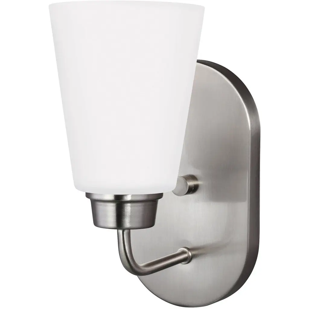 The Kerrville one light wall sconce in chrome offers shadow-free lighting in your powder room, spa, or master bath room. With a simple, airy appearance, the Kerrville lighting collection by embraces its modern design roots while enhancing virtually any homes decor. Tubular steel arms extend outward and curve to present beautiful tapered, Satin Etched glass shades. The collection has a Brushed Nickel, Burnt Sienna or Chrome finish and offers three-, five- and nine-light chandeliers, a one-light mini pendant, one- and three-light pendants, a two-light semi-flush mount which can convert to a pendant, and one-, two-, three- and four-light bath fixtures. Incandescent and ENERGY STAR-qualified LED lamping are available; all fixtures are California Title 24 compliant.