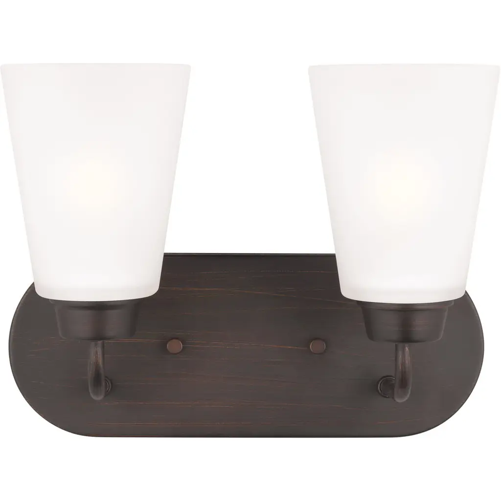 The Kerrville two light vanity fixture in bronze provides abundant light for your bath vanity, while adding a layer of today's style to your interior design. With a simple, airy appearance, the Kerrville lighting collection by embraces its modern design roots while enhancing virtually any homes decor. Tubular steel arms extend outward and curve to present beautiful tapered, Satin Etched glass shades. The collection has a Brushed Nickel, Burnt Sienna or Chrome finish and offers three-, five- and nine-light chandeliers, a one-light mini pendant, one- and three-light pendants, a two-light semi-flush mount which can convert to a pendant, and one-, two-, three- and four-light bath fixtures. Incandescent and ENERGY STAR-qualified LED lamping are available; all fixtures are California Title 24 compliant.