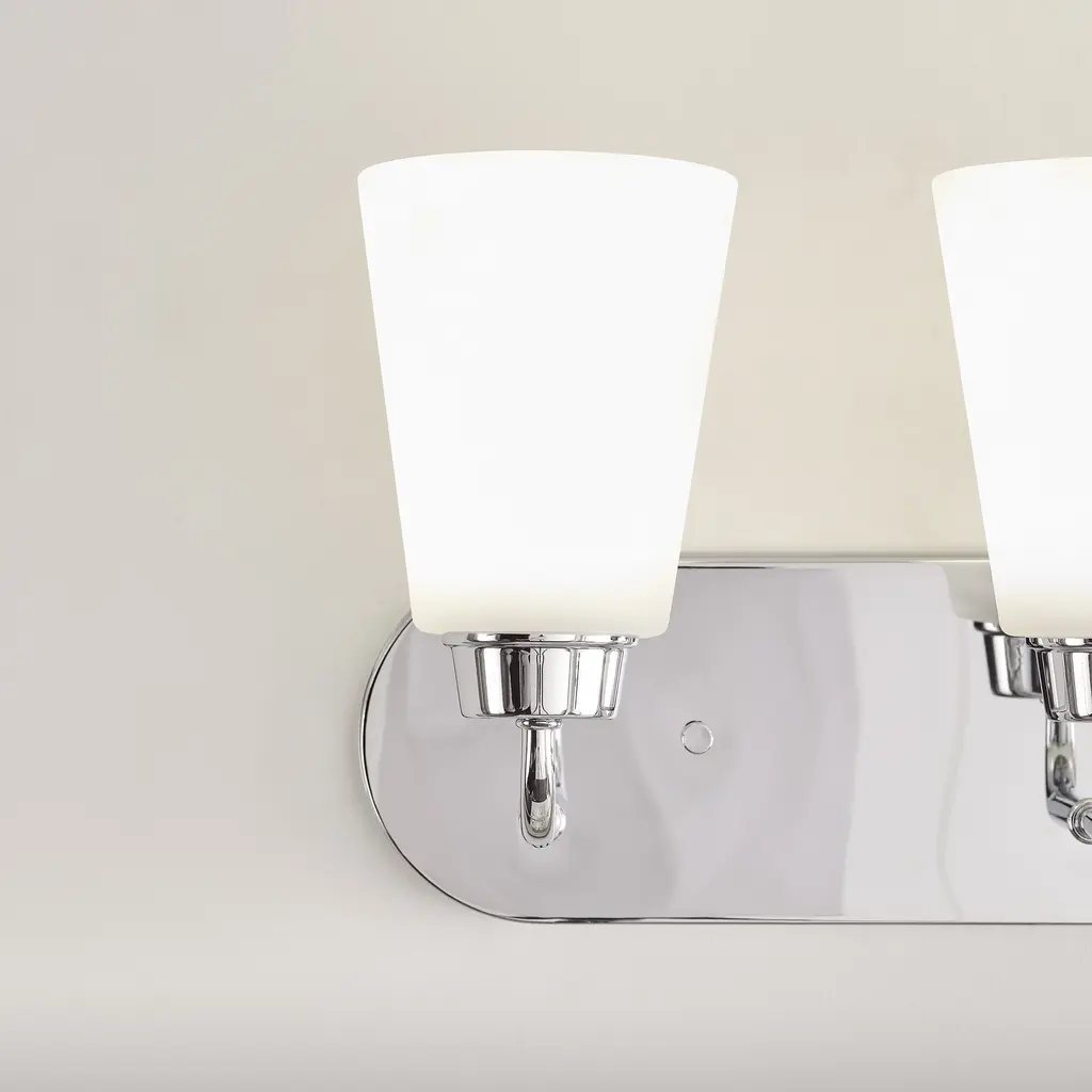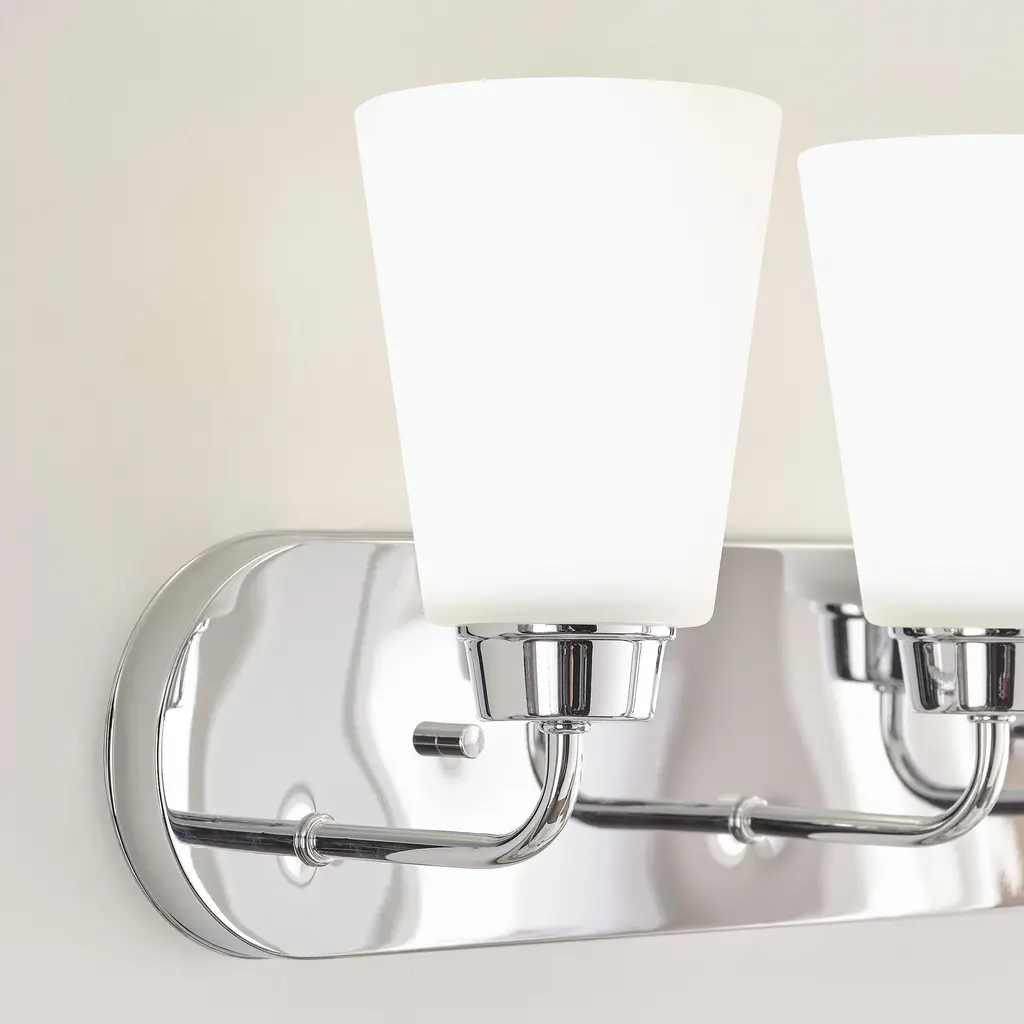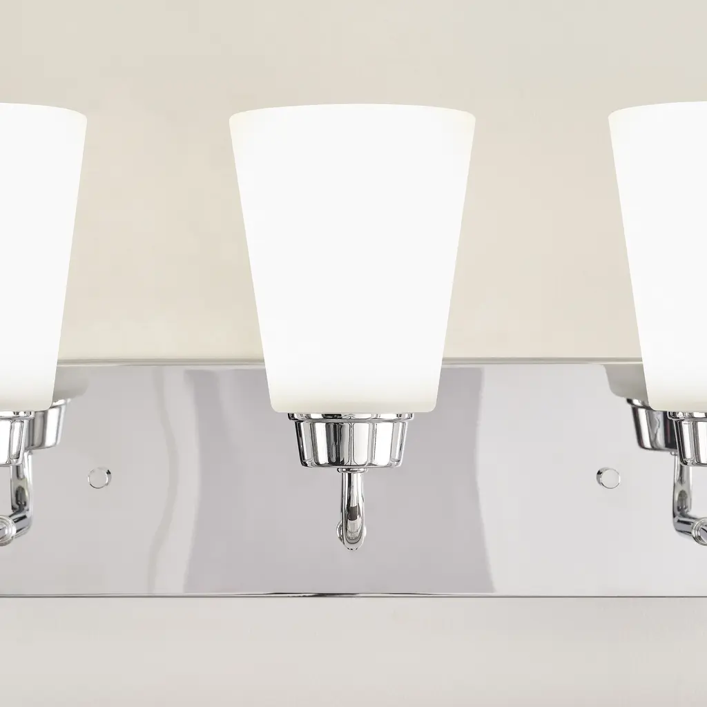 The Kerrville three light vanity fixture in chrome provides abundant light for your bath vanity, while adding a layer of today's style to your interior design. With a simple, airy appearance, the Kerrville lighting collection by embraces its modern design roots while enhancing virtually any homes decor. Tubular steel arms extend outward and curve to present beautiful tapered, Satin Etched glass shades. The collection has a Brushed Nickel, Burnt Sienna or Chrome finish and offers three-, five- and nine-light chandeliers, a one-light mini pendant, one- and three-light pendants, a two-light semi-flush mount which can convert to a pendant, and one-, two-, three- and four-light bath fixtures. Incandescent and ENERGY STAR-qualified LED lamping are available; all fixtures are California Title 24 compliant.