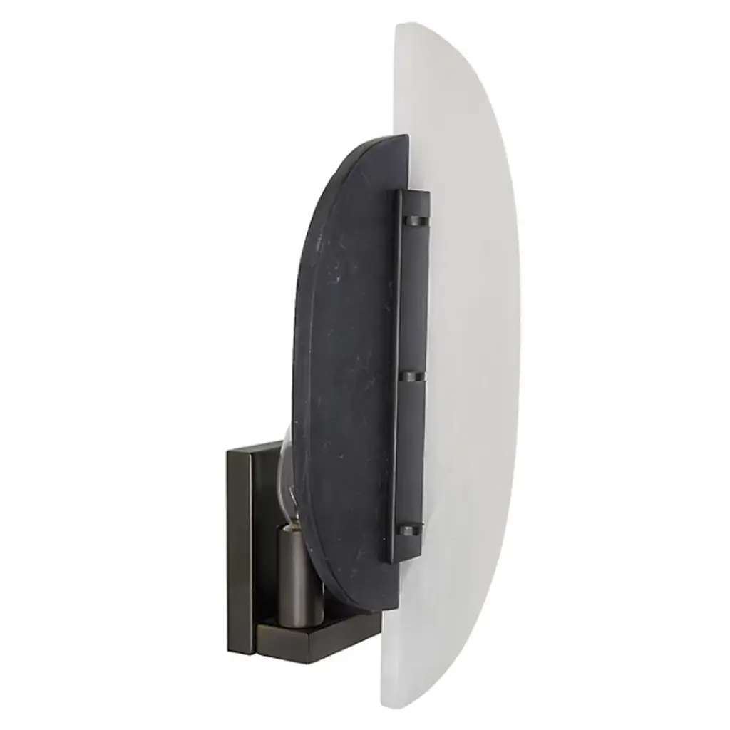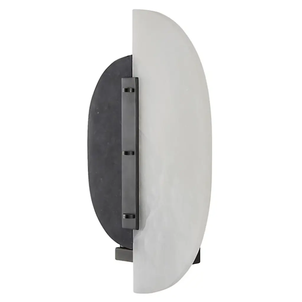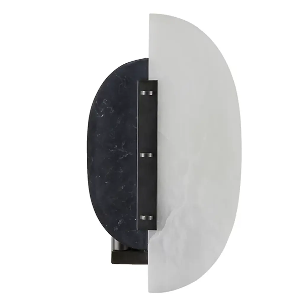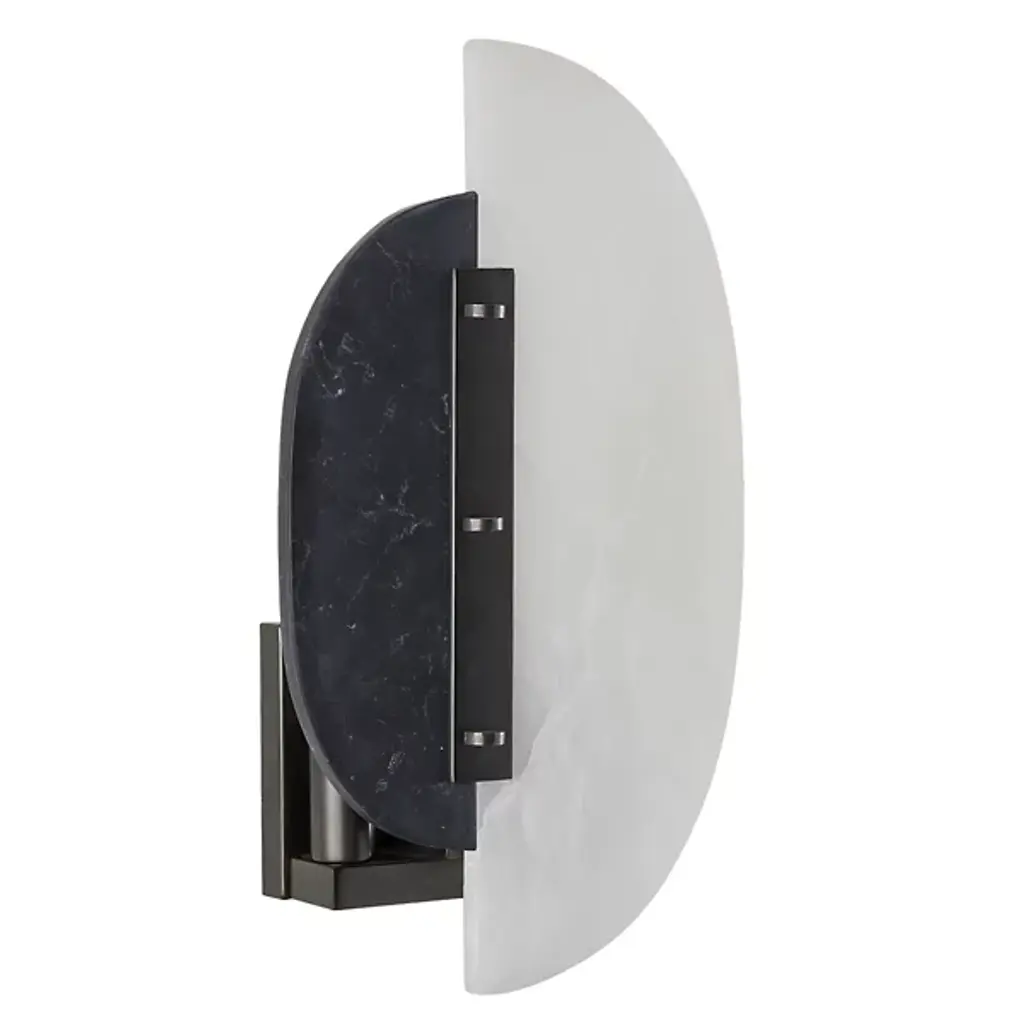 The Kianna Wall Sconce from Arteriors blends artistry and functionality. This sculptural sconce features elegantly curved lines, crafted from luxurious alabaster and overlaid with an asymmetrical plate of black marble. The combination of these rich materials creates an intriguing visual contrast that makes it stand out. Accented with English bronze steel, this wall sconce integrates architectural elements into its design. It is a unique piece with subtle variations in finish that highlight its natural beauty.