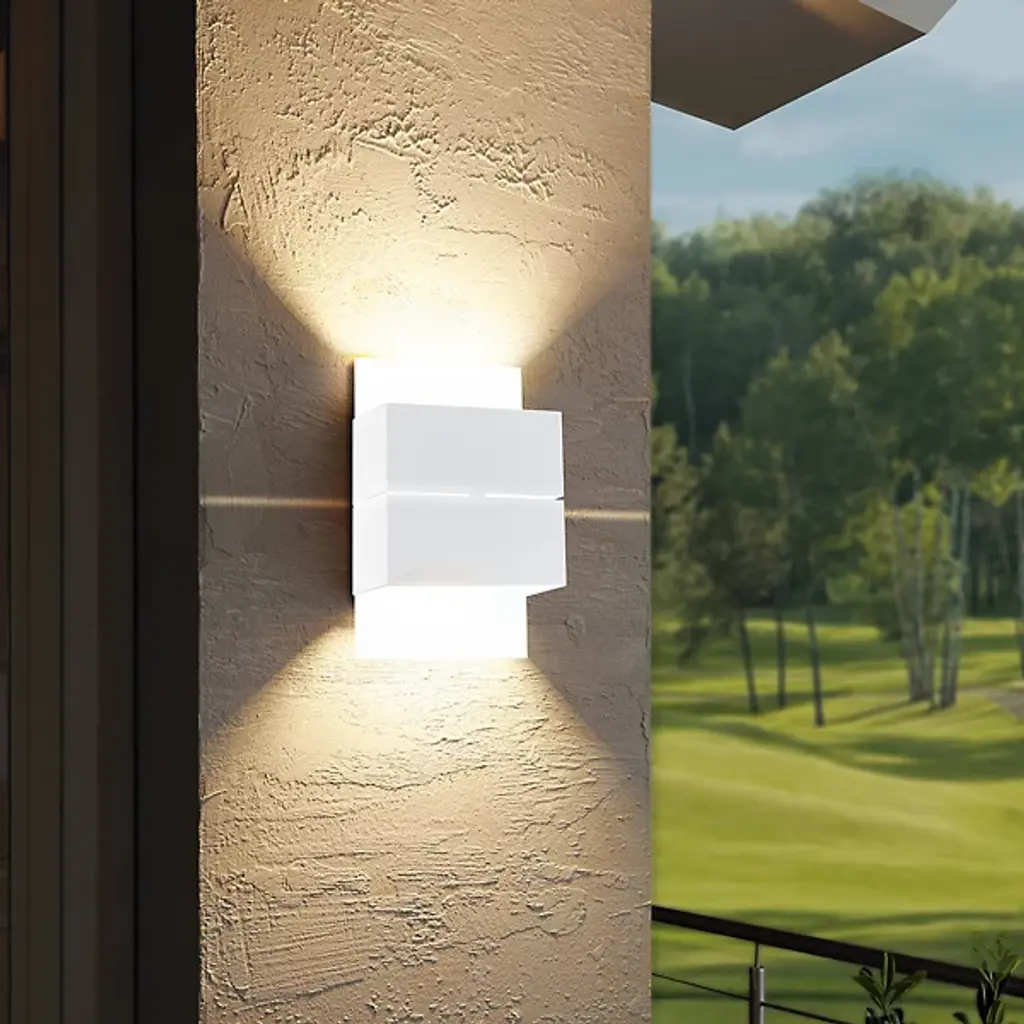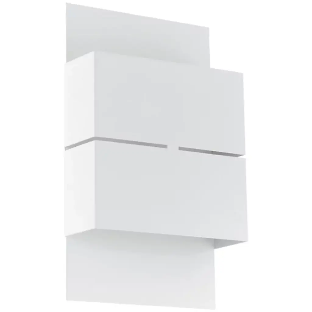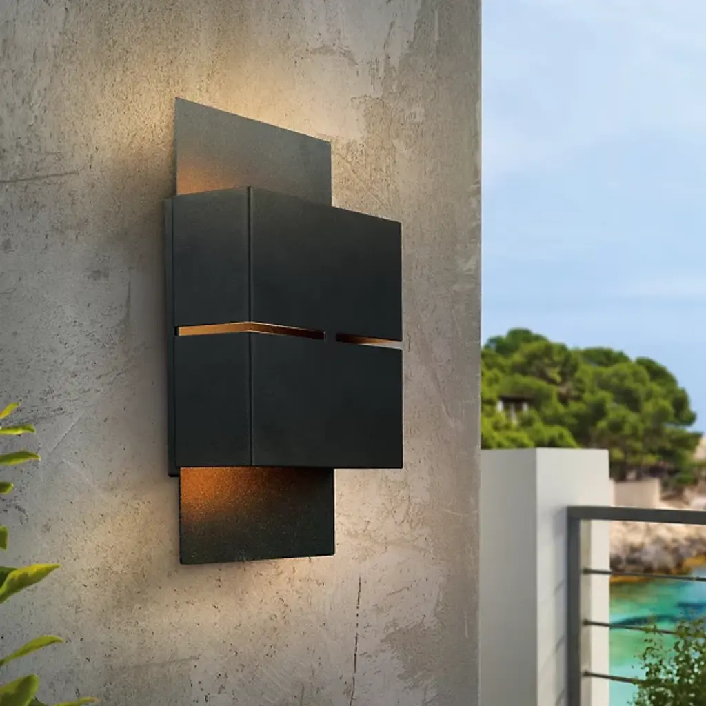 The Eglo Kibea Outdoor LED Wall Sconce will keep your outdoor living space safe and illuminated with a contemporary style. A rectangular backplate hosts two projecting shades, converging at a small seam in the middle. The energy efficient light source peaks out from inside the shade, cloaking the space in a warm energy efficient light.