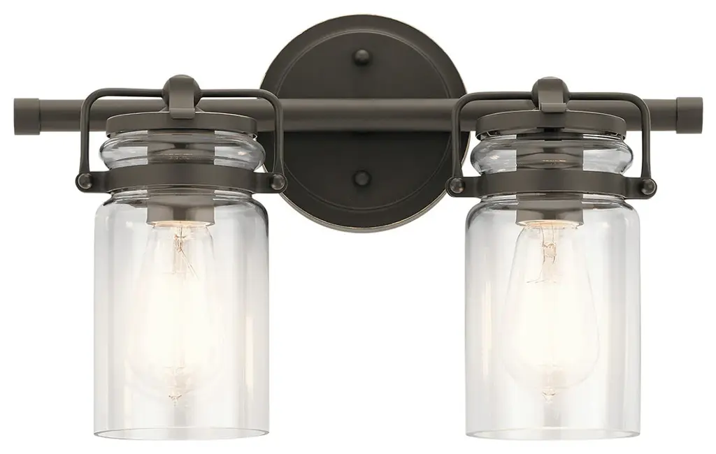 Two Light Bath from Brinley collection in Olde Bronze finish. Number of Bulbs 2. Max Wattage 75.00. No bulbs included. The vintage mason jar style of the Brinley(TM) collection 2-light bath light in Olde Bronze gives a beautifully modern treatment to the familiar and comfort of canning jars. No UL Availability at this time.