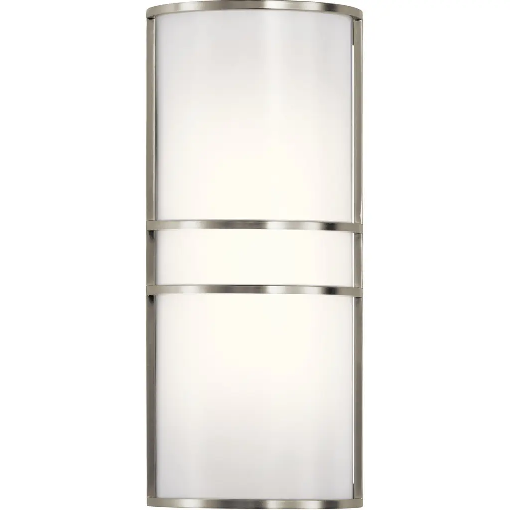 Featuring a subtle plastic frame, the white diffuser of this two-light acrylic wall sconce by Kichler is accented by a brushed nickel finish. Its energy-efficient LEDs average a life span of 45,000 hours at about 3 hours per day. Its brightness can easily be adjusted when paired with an electronic low voltage dimmer, or LED rated dimmer.