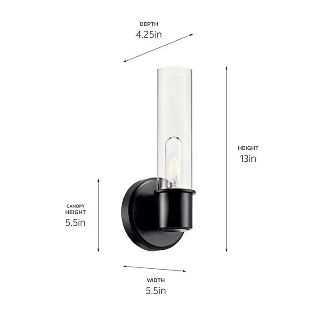 Collection: Aviv, Material: Steel, Finish Color: Black, Width: 5.5", Height: 13", Depth: 4.25", Height From Outlet Box: 10.5", Backplate Width: 5.5", Lamping Type: Incandescent, Number Of Bulbs: 1, Wattage: 60 Watts, Moisture Rating: Damp Rated, Desc: With its cylindrical clear glass shade, the Aviv wall sconce conveys a sleek style. A stunning black finish makes Aviv a versatile and timeless accent. Remove its glass for easy cleaning.,