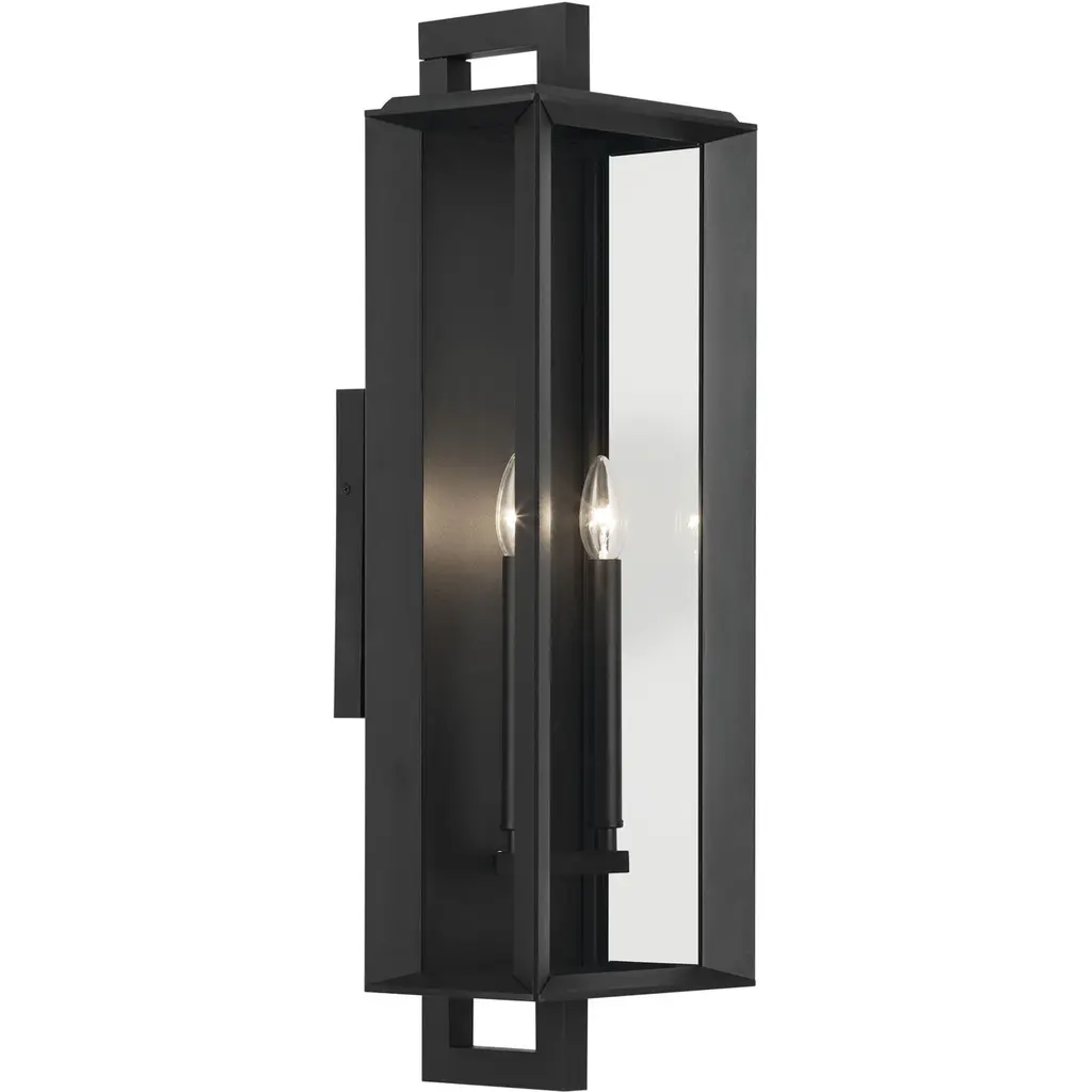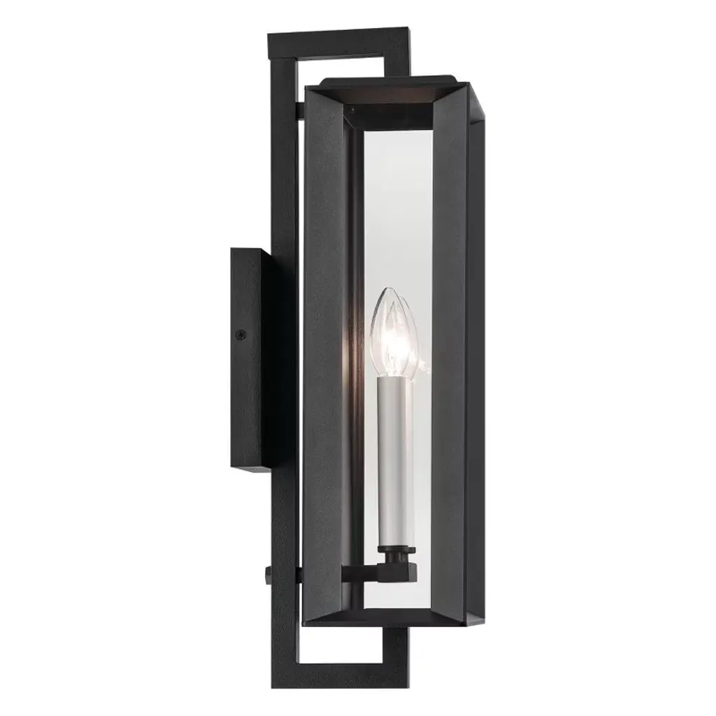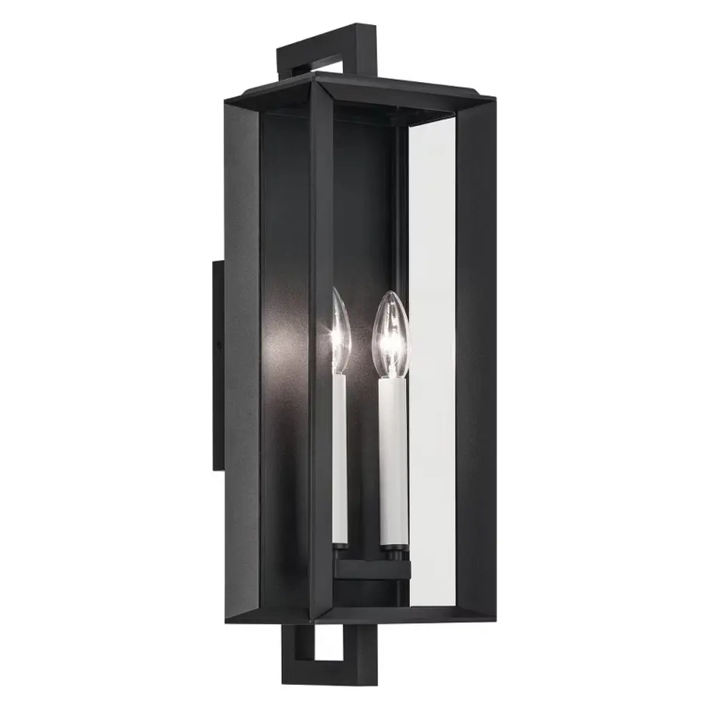 With full interior corner channels, the Kroft outdoor wall light ensures water stays out while stylishly hiding the edge of its thicker clear glass panes. Choose the black candle sleeves for a continuous black finish, or choose the white candle sleeves for added contrast and style. Material: Aluminum, Finish Color: Textured Black, Width: 7", Height: 20.5", Depth: 7.5", Height From Outlet Box: 9.75", Backplate Width: 6.75", Backplate Length: 4.75", Lamping Type: Incandescent, Number Of Bulbs: 2, Wattage: 60 Watts, Moisture Rating: Wet Rated
