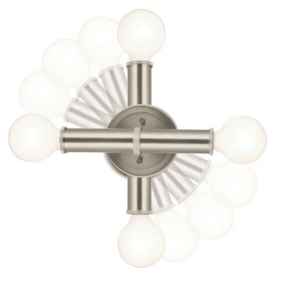 The Torche 2 light wall sconce is the ideal accent for any room. Its subtle, fine-ribbed detailing is inspired by the soft modern aesthetics of classic hardware. In champagne bronze, Torche easily complements a variety of styles. Material: Steel, Finish Color: Brushed Nickel, Width: 5", Height: 9.75", Depth: 4", Height From Outlet Box: 5", Backplate Width: 5", Lamping Type: Incandescent, Number Of Bulbs: 2, Wattage: 60 Watts, Dimmable: Yes,