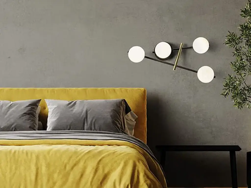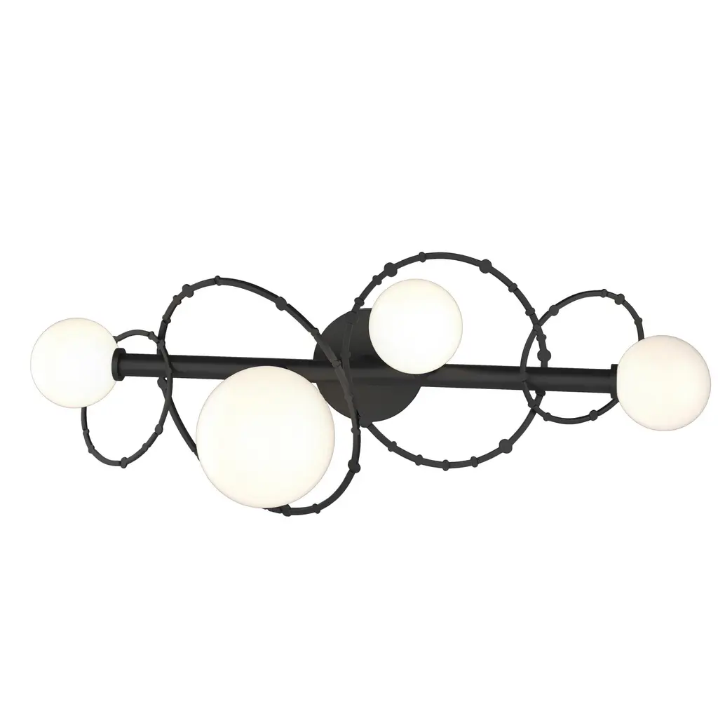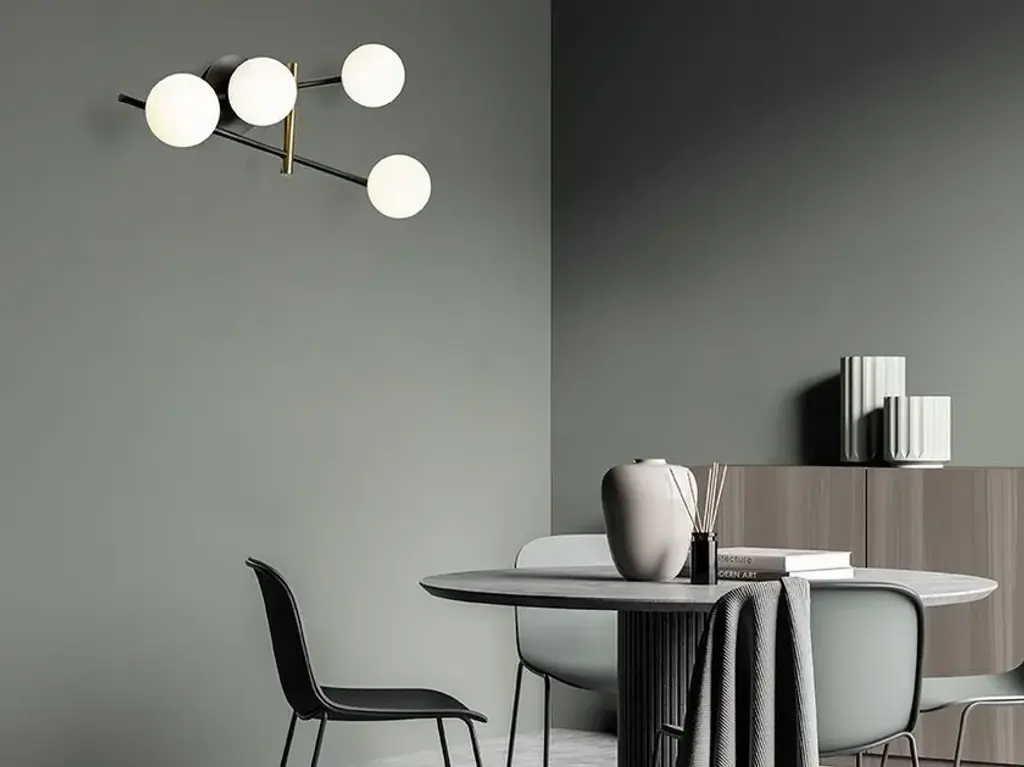 Wall lamp from the KIKA metal collection, in Liquorice Black with Brushed Gold detail. Milk-white blown glass.Light source: G9 LED, Power: 4 x max. 10WThe balance of randomness. In the KIKA collection, the random positioning of the opaline glass spheres on the thin liquorice rods is designed to find harmony in the chaos and thus give balance to the composition, while also enlarging the illuminated space. The thick central rod in brushed gold lends preciousness and connects all the elements, acting as a spokesperson for the connection between different natures.