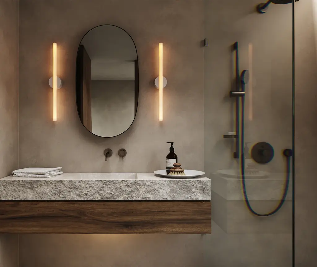 Named in reference to the delicate confluence of the linear light source and central pivoting fixture, the light frosted finish subtly exposes and celebrates the internal filament when illuminated while maintaining the form of a typical S14d light source. The Kilter Wall Light fixture is available in White, Dark Grey, and Solid Brass enamel finishes and is rated IP44, making it an ideal bath bar or vanity light. The Kilter light source is available in two lengths and two color temperatures.