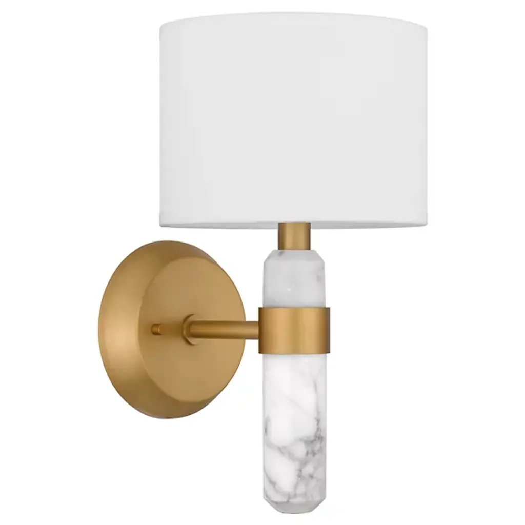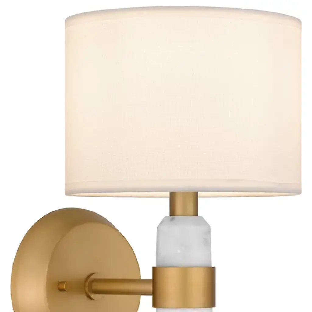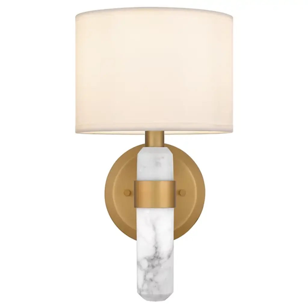 The Kimberly Wall Sconce from Quoizel carries an elegant design language scaled for wall-mounted applications. The fixture incorporates a fabric shade along with a marble accent, adding a luxurious touch to its classic form. Crafted from durable steel, the Kimberly Wall Sconce is built to maintain its polished look over time. Its nifty structure makes it a brilliant choice for bathroom vanities and hallways to bedrooms and dining areas, enhancing the setting with its refined presence.