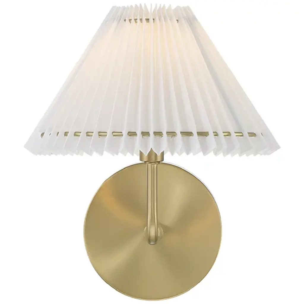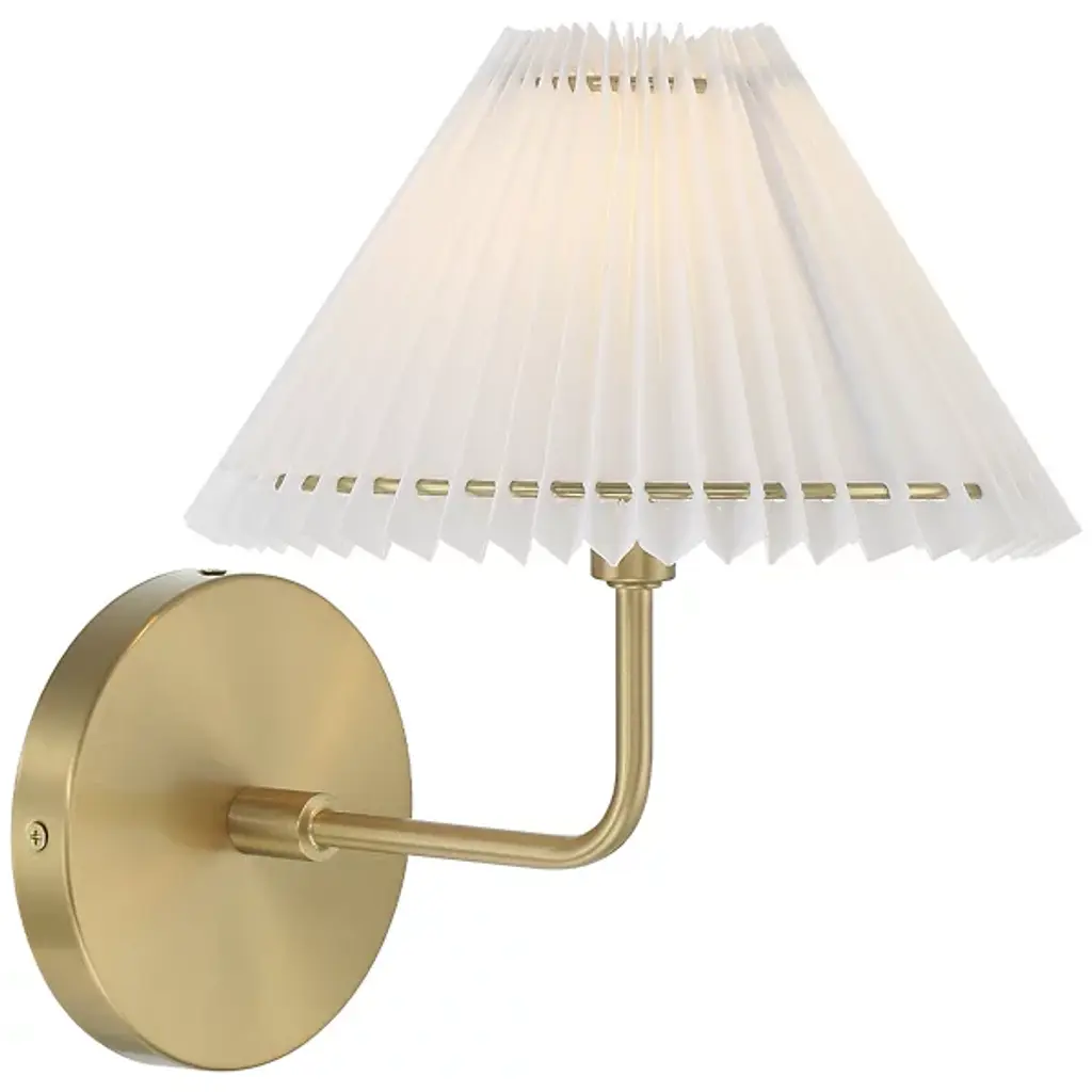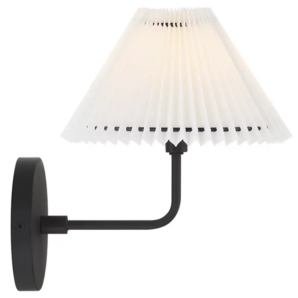 The Kira Wall Sconce from Savoy House is an exquisite fusion of mid-century modern charm and transitional elegance. Crafted from premium metal, this wall sconce features a streamlined design. Its slightly curved arm, adorned with a white pleated fabric shade, crowns the fixture, adding a soft and inviting glow to your environment. A candelabra base LED lights up your hallway, bedroom, or other interior setting. This sconce is securely attached to your wall using a durable round backplate.