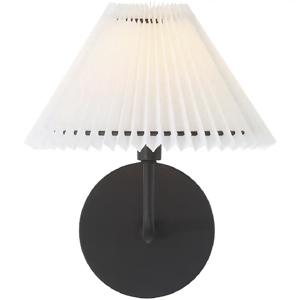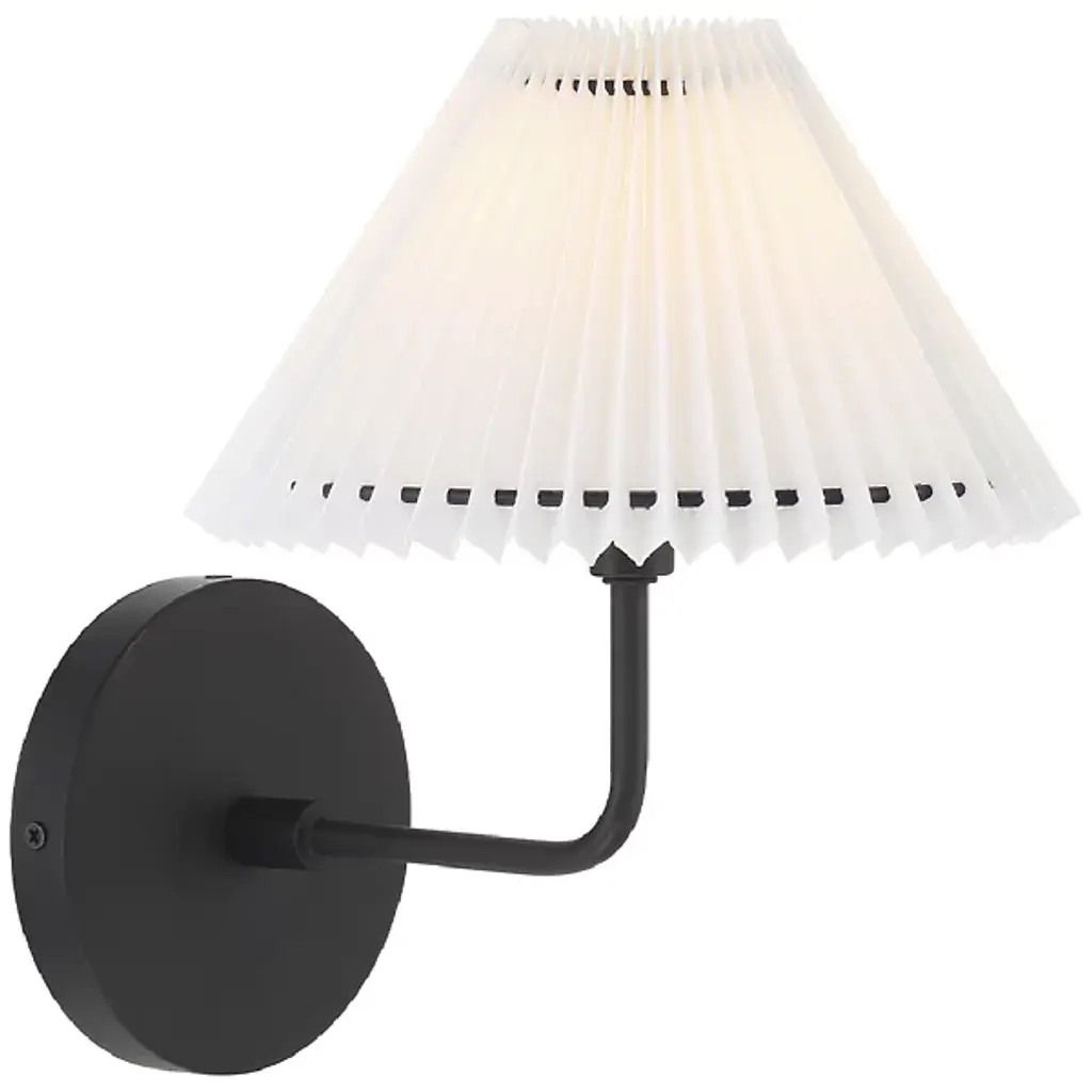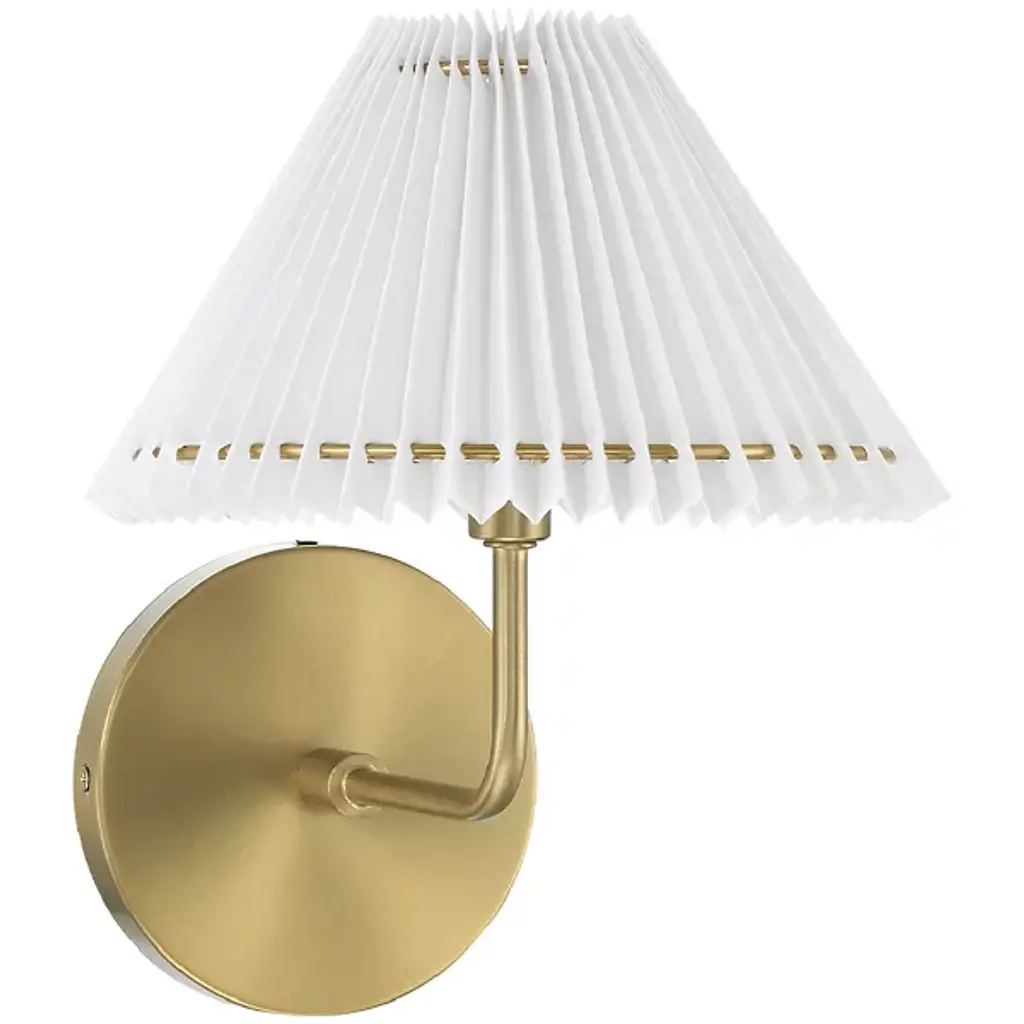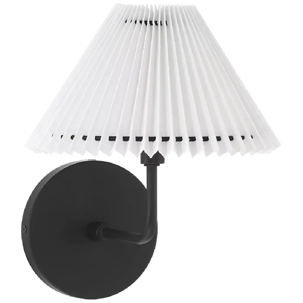 The Kira Wall Sconce from Savoy House is an exquisite fusion of mid-century modern charm and transitional elegance. Crafted from premium metal, this wall sconce features a streamlined design. Its slightly curved arm, adorned with a white pleated fabric shade, crowns the fixture, adding a soft and inviting glow to your environment. A candelabra base LED lights up your hallway, bedroom, or other interior setting. This sconce is securely attached to your wall using a durable round backplate.