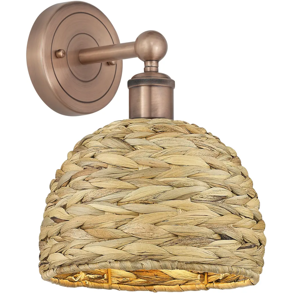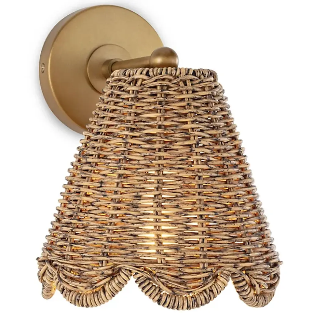 The Kismet Hanging Wall Sconce from Regina Andrew is where coastal charm meets transitional elegance. Crafted from high-quality faux rattan plastic, this wall sconce exudes coastal vibes while maintaining a sophisticated transitional aesthetic. This wall sconce is dimmable when used with an ELV dimmer. Secured by a round backplate, the shade hangs gracefully, creating a refined look that complements a variety of décor styles. The curved ends of the shade add visual interest.