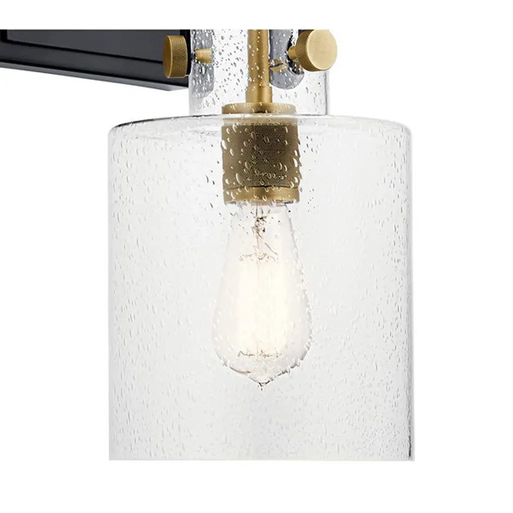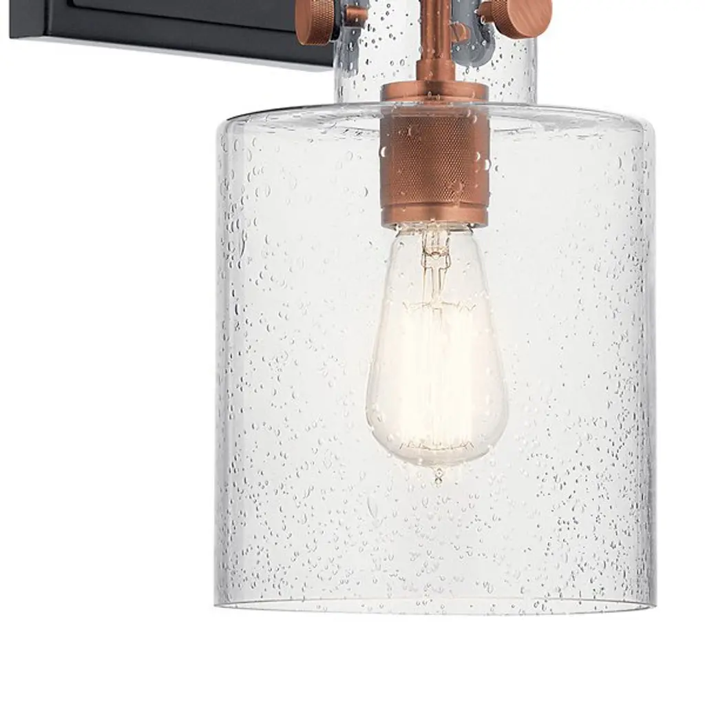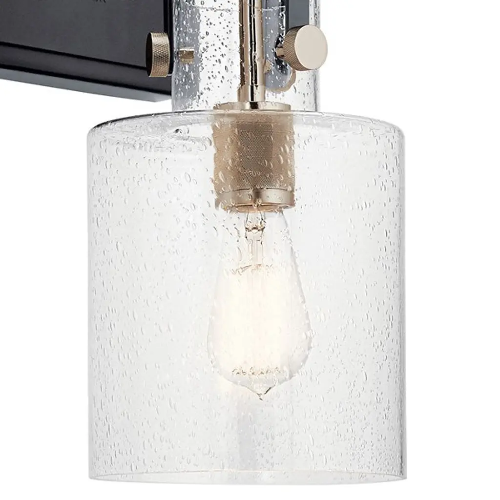 An elegant design with a modern style. The Kitner Wall Sconce from Kichler is a versatile addition to interior décor. Its square metal backplate anchors the piece to the wall as it sends a slender arm forward to hold an incandescent bulb. A cylindrical shade made of clear seeded glass surrounds the lamping, catching its light and creating a glistening effect as it brightens. Contrasting metal bands support the shade and offer an updated industrial feel.