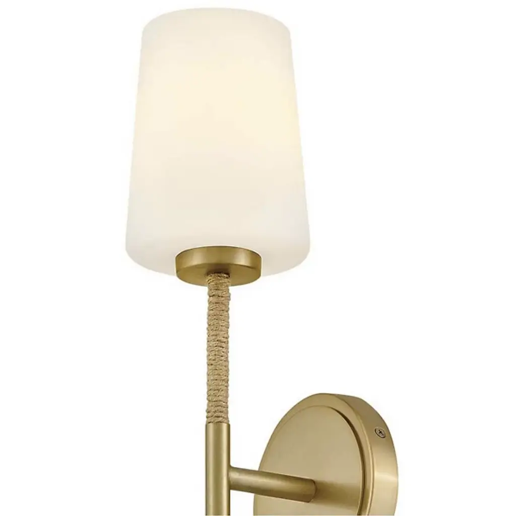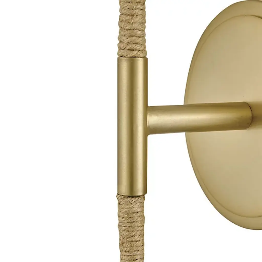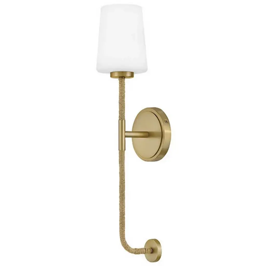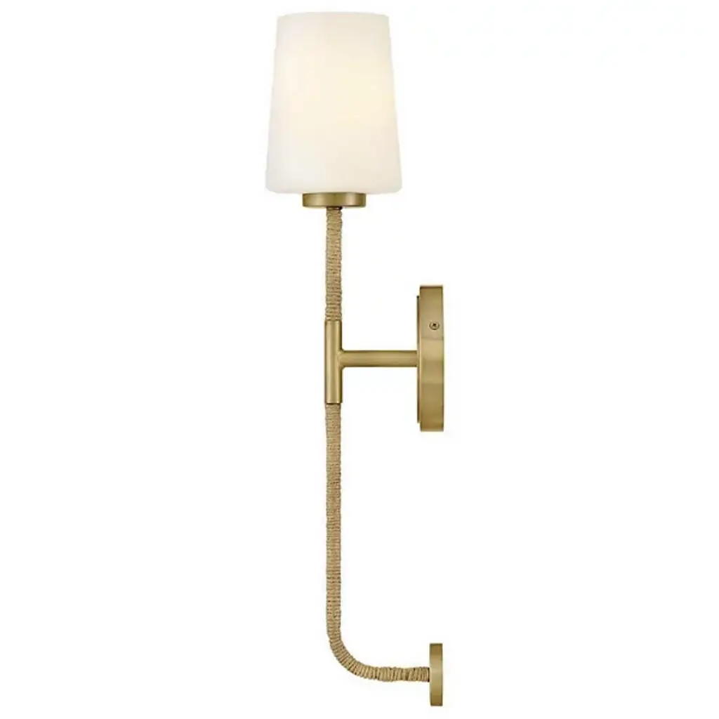 The Kline Wall Sconce from Lark brings rustic texture and soft light to your walls with its simple silhouette and distinctive details. A rope-wrapped stem adds a natural touch beneath the etched opal glass shade, contrasting a more textured rope with the smooth metal. The cup-shaped shade gently bevels inward, diffusing light outward with a warm, even glow, while the damp-rated lamp allows it to be mounted in any indoor environment.