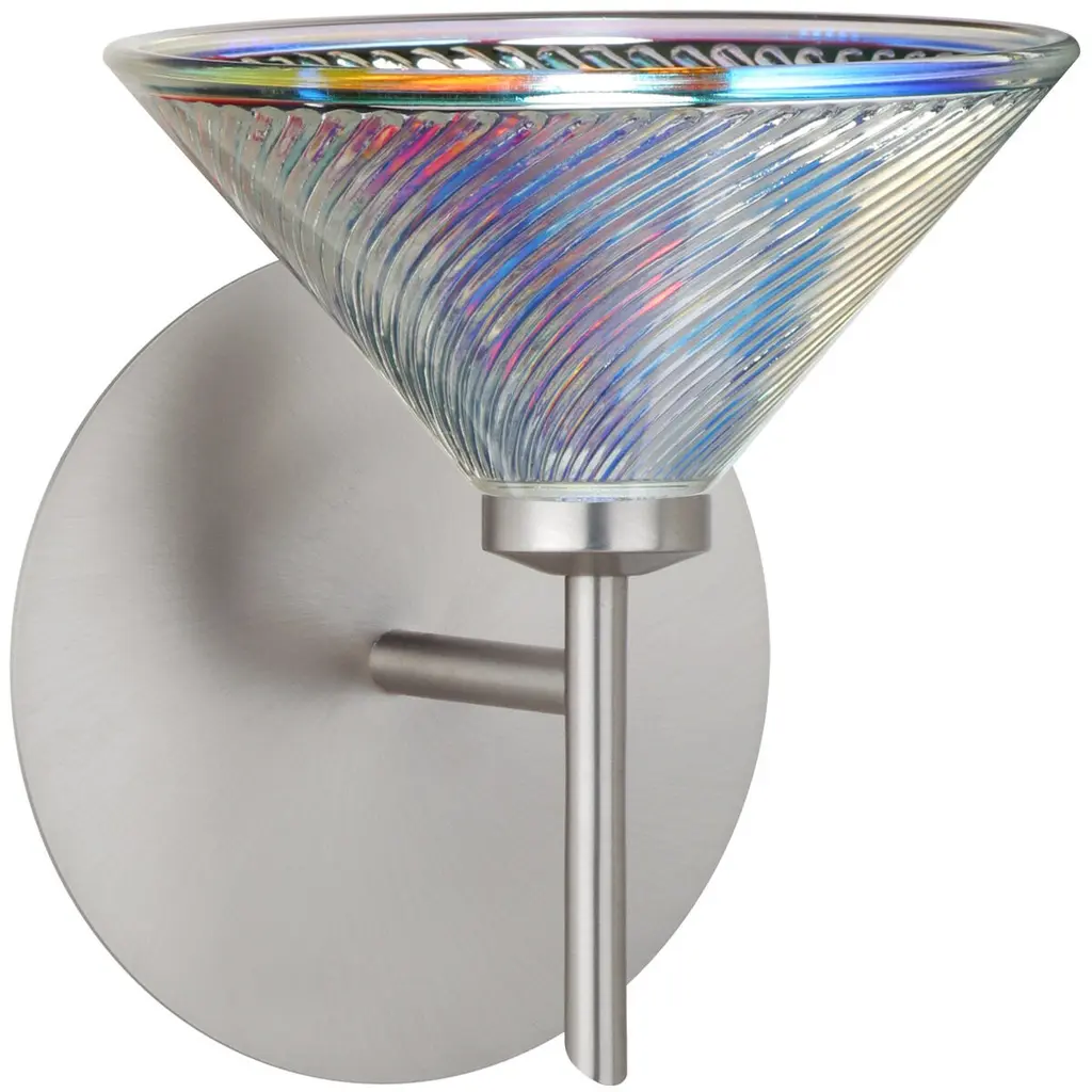The Kona features a wide cone-shaped glass, that demonstrates contemporary sensibilities. Our Dicro glass is clear blown glass with a technologically advanced dichroic coating applied to the inside. The coating contains multiple micro-layers of metals that create unique optical properties, which effectively alter both the reflected and transmitted light. So unlit, it appears like a mirror; when lit, it becomes translucent with an array of multicolored blue-purple effects. The mini sconce is equipped with a decorative lamp holder mounted to either a low profile round or square canopy. These stylish and functional luminaries are offered in a beautiful Chrome finish.