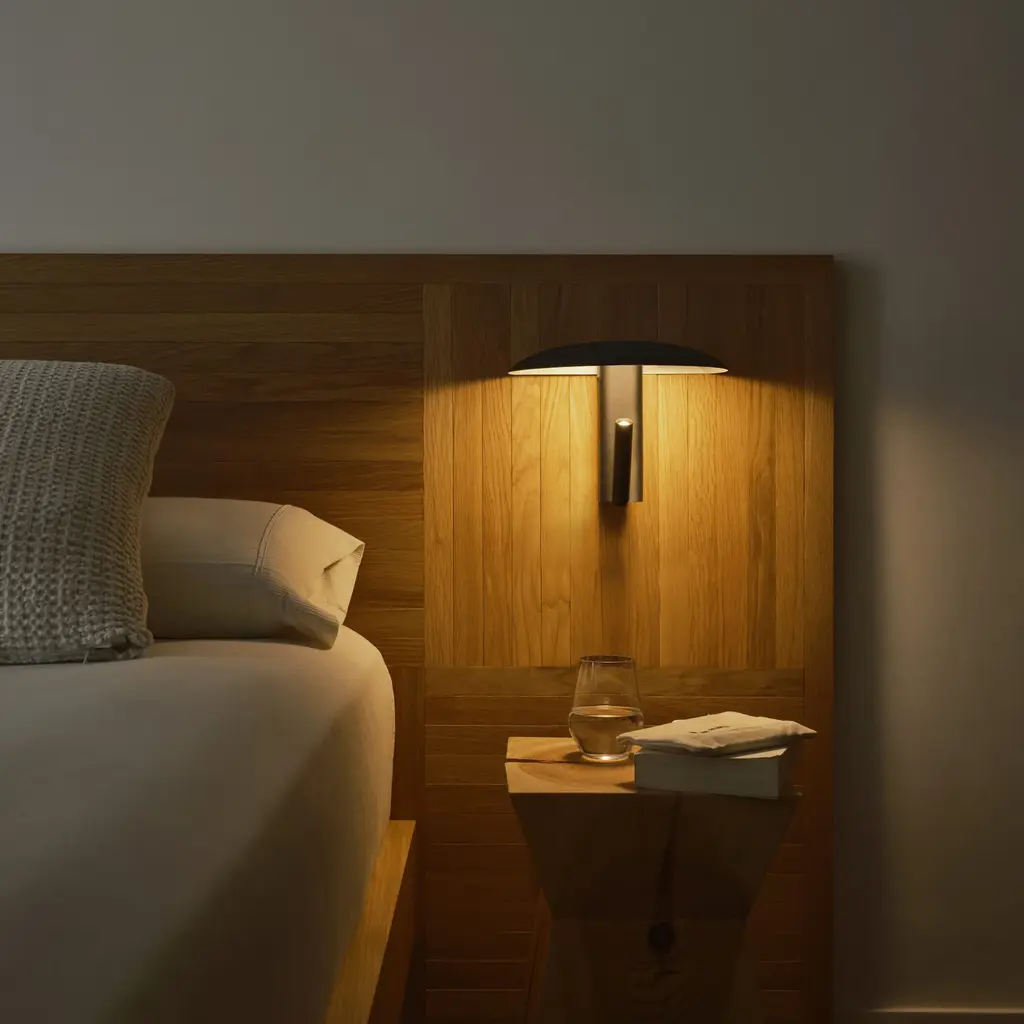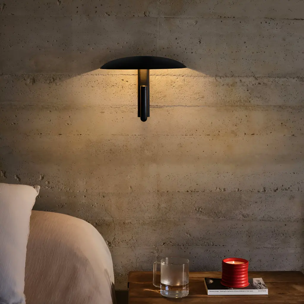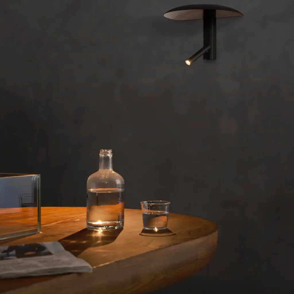 A model of minimalist versatility, Konoha offers a choice of direct or overall illumination with its clever directed spotlight that rotates 360 degrees. Under the hat-like shade, aim the light up and it bounces off the inside for an ambiant glow. Or point it downwards and the directed beam, turns the fixture into a reading lamp.