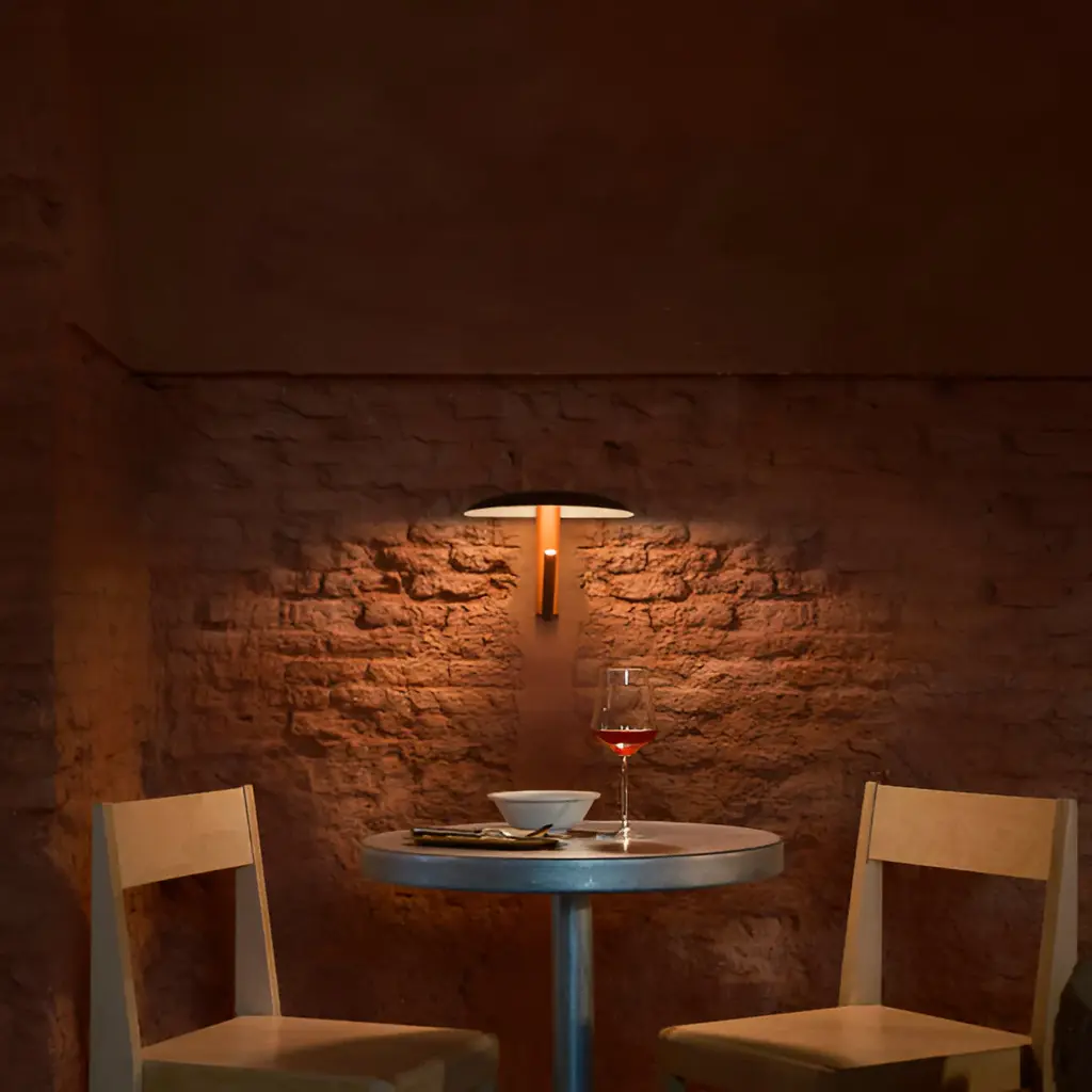 Konoha Wide brings brawnier proportions to Marset’s twin-function wall lamp that combines direct and ambient illumination. Yabu Pushelberg studio has devised a wall fixture with a directed spotlight that turns 360 degrees. Pointing up, the light bounces off the inside of the hat-like shade for an overall glow. Aimed downwards, it projects a direct beam, turning the fixture into a reading lamp.