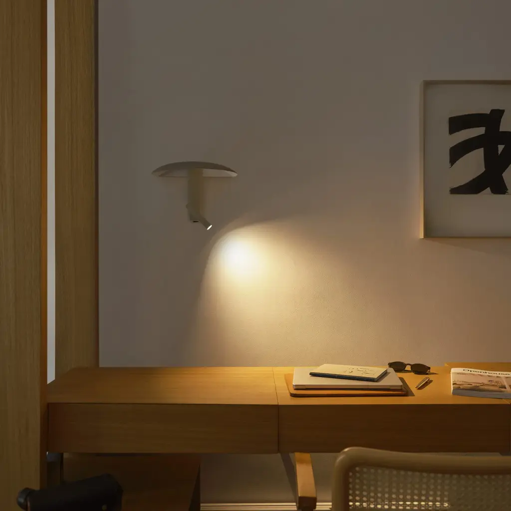 Konoha Wide brings brawnier proportions to Marset’s twin-function wall lamp that combines direct and ambient illumination. Yabu Pushelberg studio has devised a wall fixture with a directed spotlight that turns 360 degrees. Pointing up, the light bounces off the inside of the hat-like shade for an overall glow. Aimed downwards, it projects a direct beam, turning the fixture into a reading lamp.