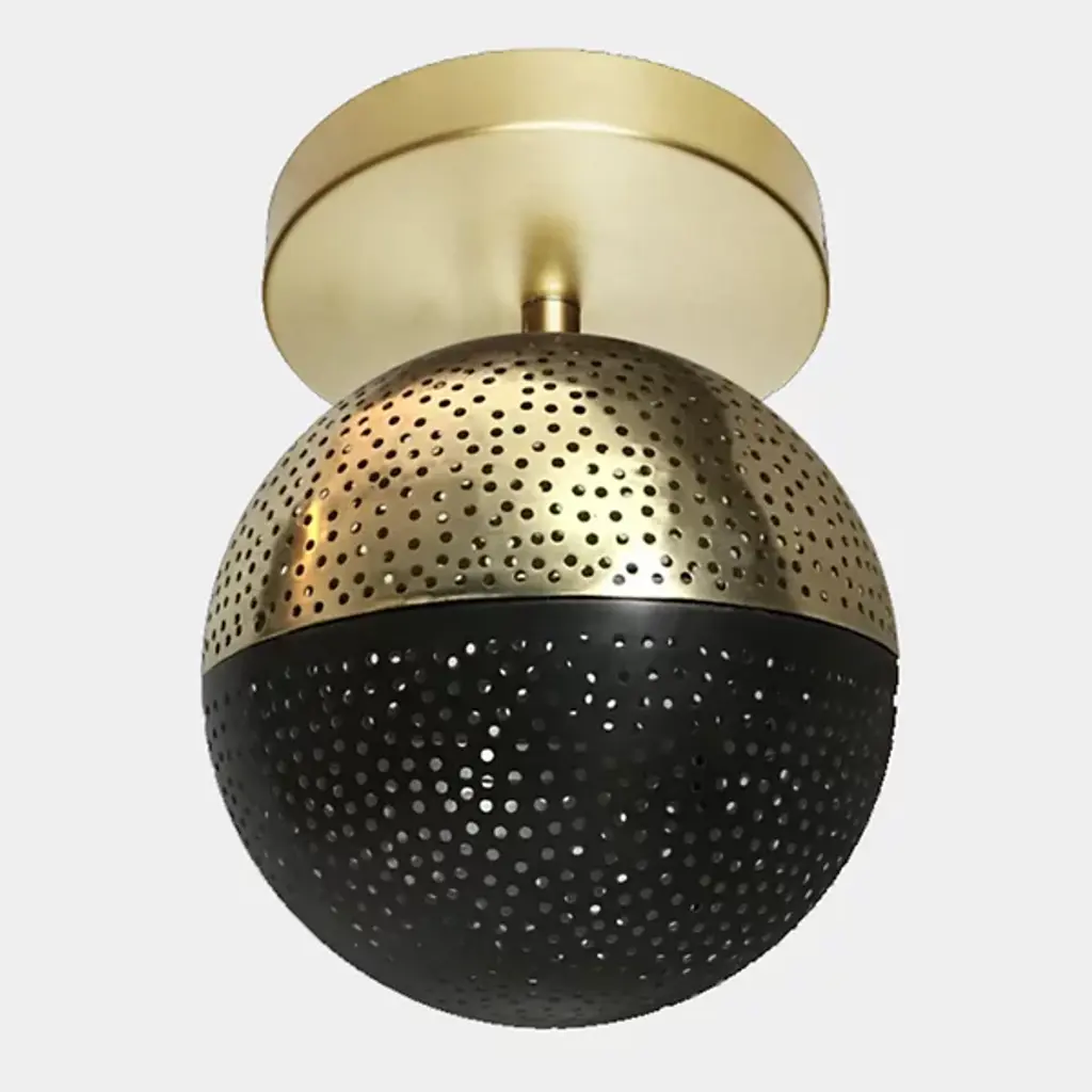 Live in luxury with the Kora Wall / Ceiling Light by Dounia Home. Metal has been finely worked into the form of a globe-shaped encasement. This globe’s surface has been neatly pierced, giving this fixture a look of intricacy. Your pendant’s casing contains an incandescent bulb that diffuses light through the pendant’s piercings to give your home a pleasant glow. Your light fixture has the capability to function as either a wall sconce or a ceiling light. Whichever way you wish to enjoy your light fixture, a disc-shaped plate will keep your furnishment well- secured. The Kora Wall / Ceiling light from artisan, Larbi, embodies the fine craftsmanship of the Moroccan design tradition that endures to the present day.