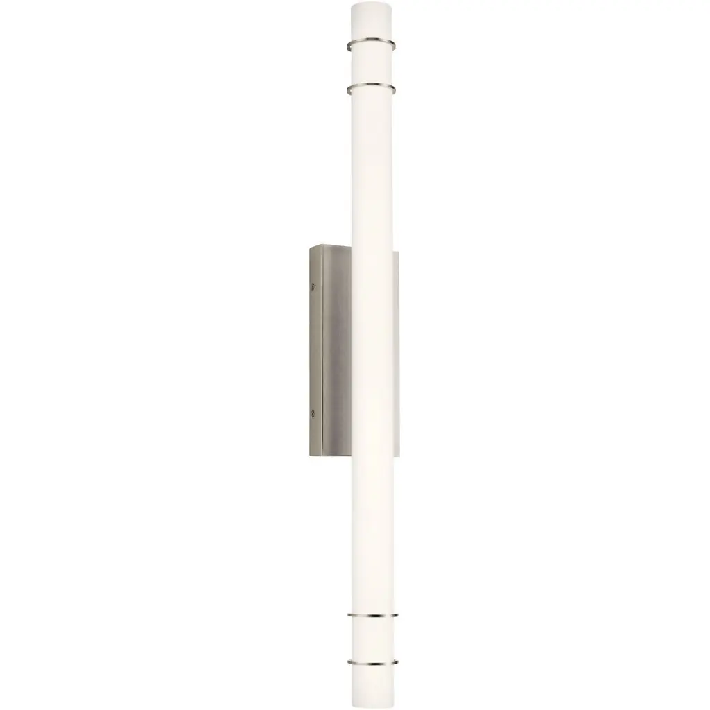 Bring sleek sophistication to a bath with the polished look of the 36in.in. LED bath light from the Korona collection. A White Acrylic diffuser is accented with rings of Brushed Nickel to add brilliance to this appealing piece.