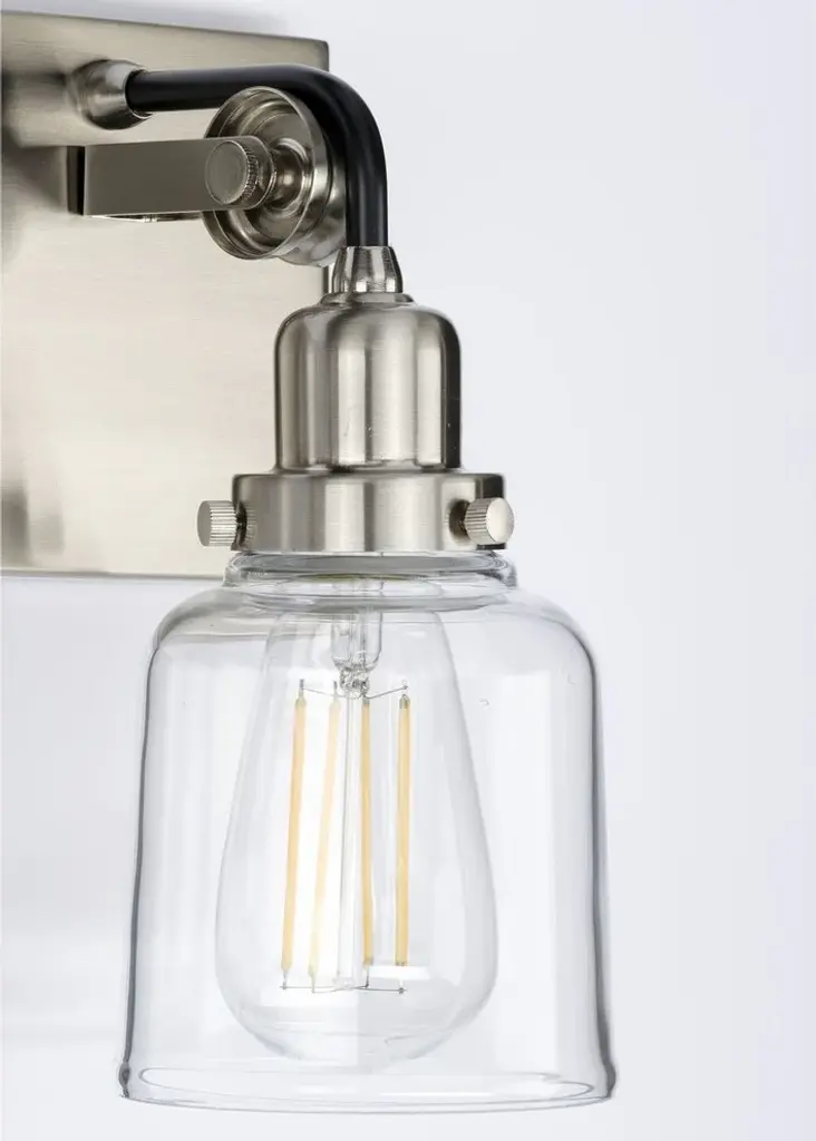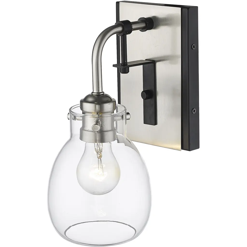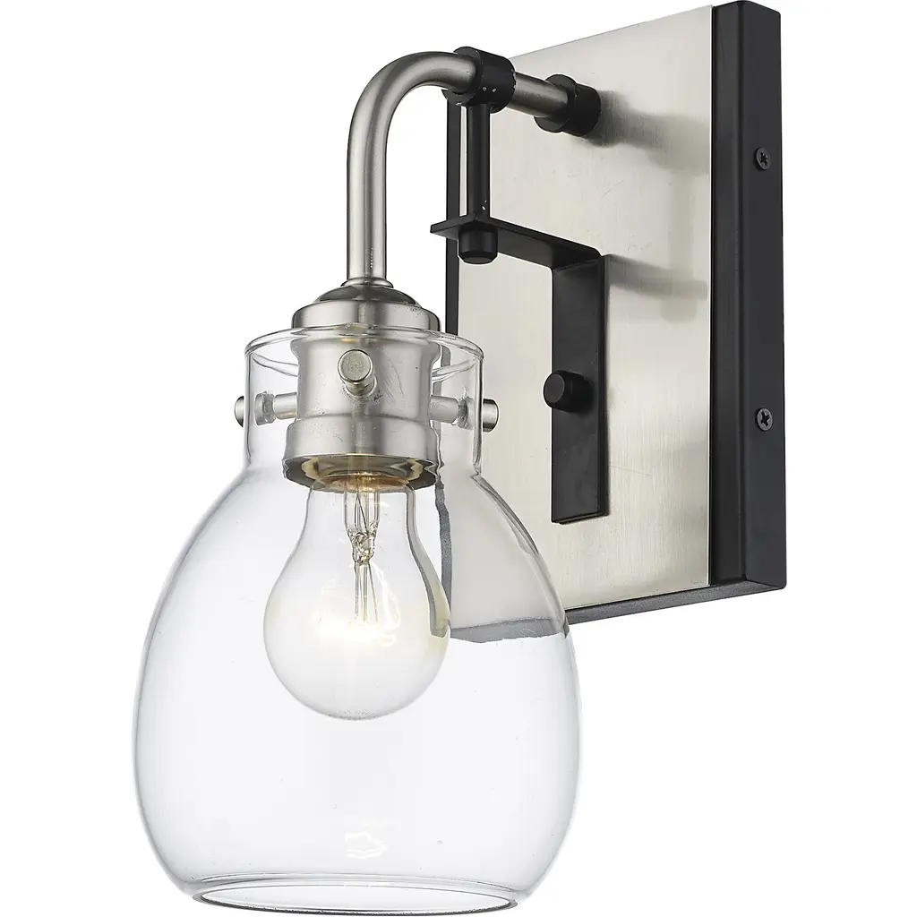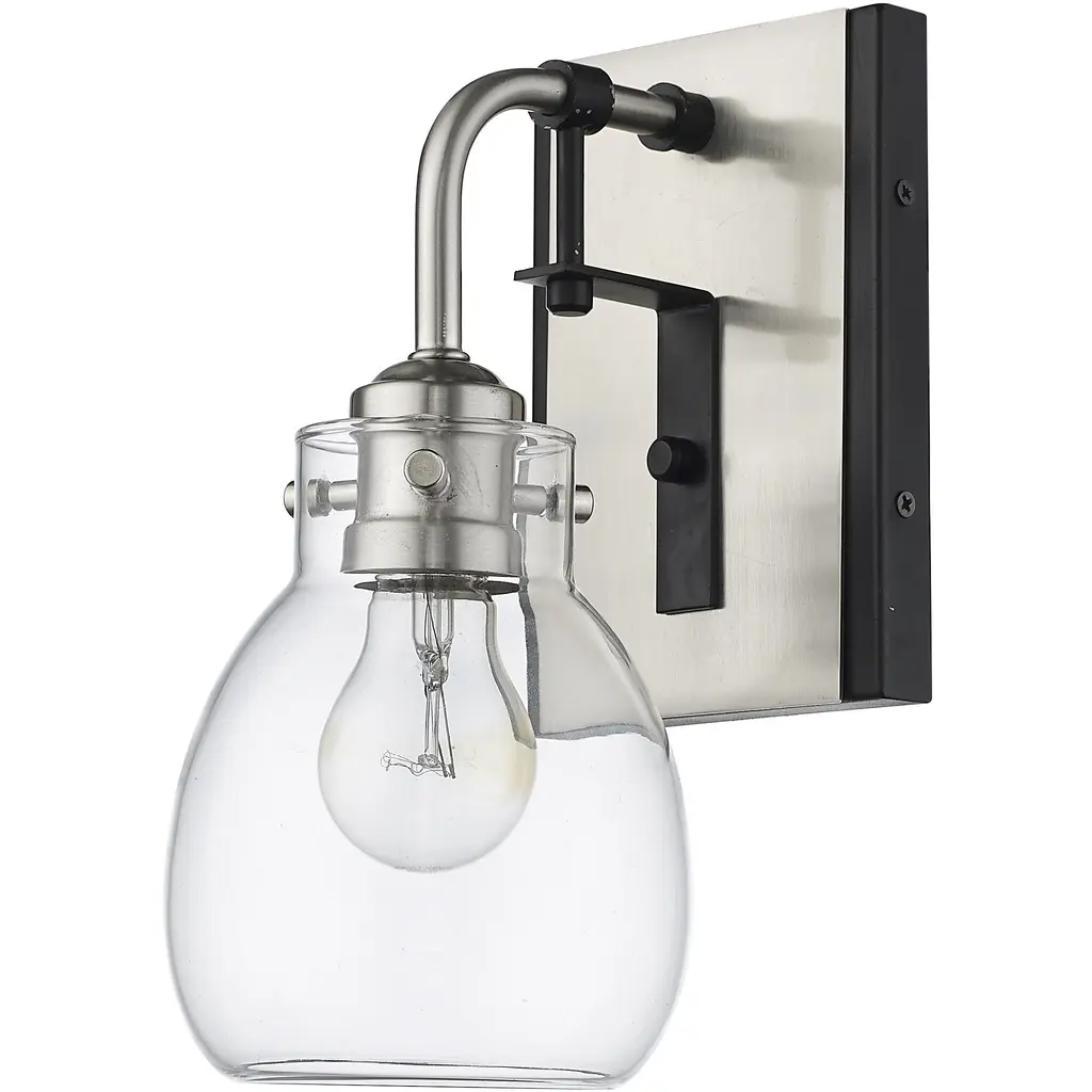 Designed with dual-tone hues, this one-light wall sconce marries matte black and brushed nickel hues. A clear glass shade is full of elegant details, creating a bright glow.