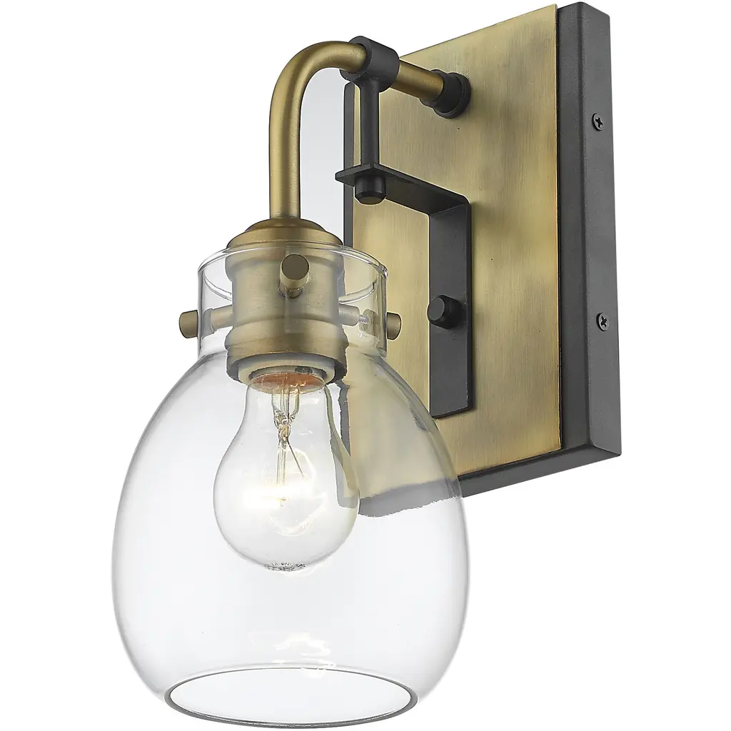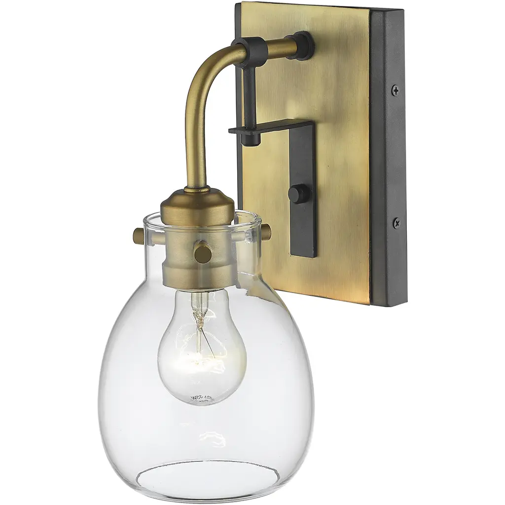 Classic transitional fare helps illuminate a custom space as it adds a sleek, sophisticated vibe. This matte black and olde brass finish wall sconce offers a clear linear silhouette with a romantic round clear glass shade.