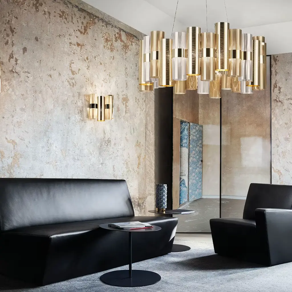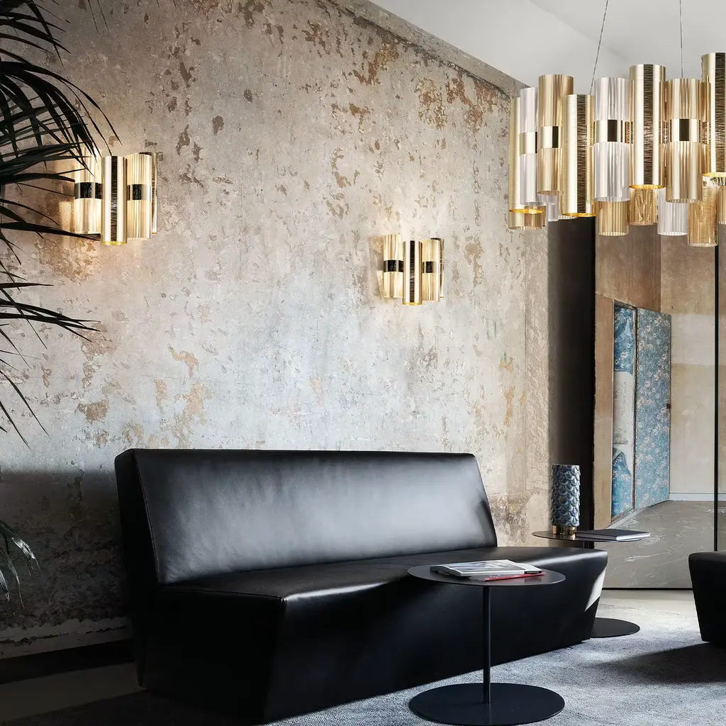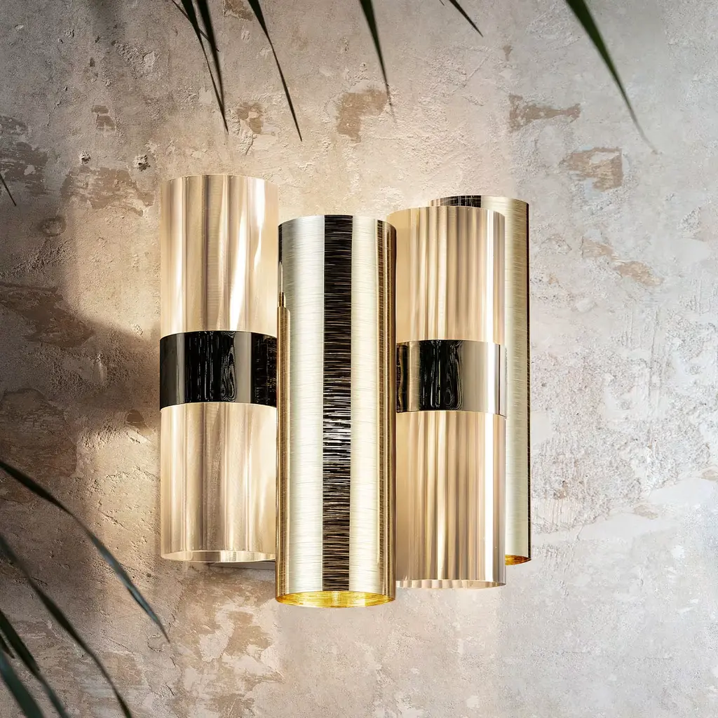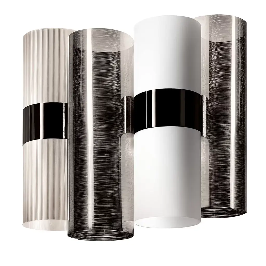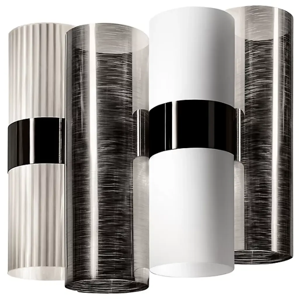 With its geometric and appealing design, the La Lollo Sconce will create a focal point in any room, offering both warm lighting and style either in pairs flanking a foyer mirror or in multiples along a stairway or hallway. Composed of four cylindrical diffusers in Slamp's patented techno-polymer, an unbreakable polycarbonate with glass-like lustrous quality, showcasing warm golden hues and different decorative patterns. It requires 2 x E26 6W max LED filament lightbulbs (not included).