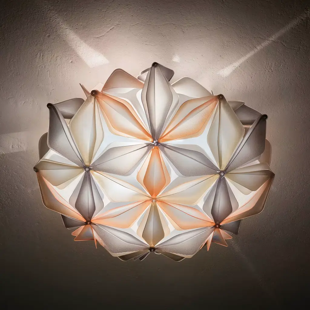 Recalling the image of graceful flowers in captivating amber hues, this ceiling light is an exclusive design by Adriano Rachele inspired by the geometric symbol of Flower of Life created by overlapping 19 circles. Mounted on the ceiling or wall with a patented magnetic system that allows for easy installation and cleaning, the shade is crafted entirely of Opalflex®, an exclusive, patented material that mixes techno-polymers and glass crystals, and painted using silk-screen printing. This highly decorative lighting offers ambient illumination via two E27 max 12W LEDs (not included).