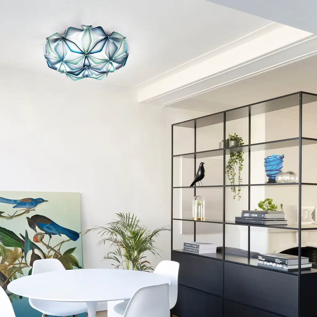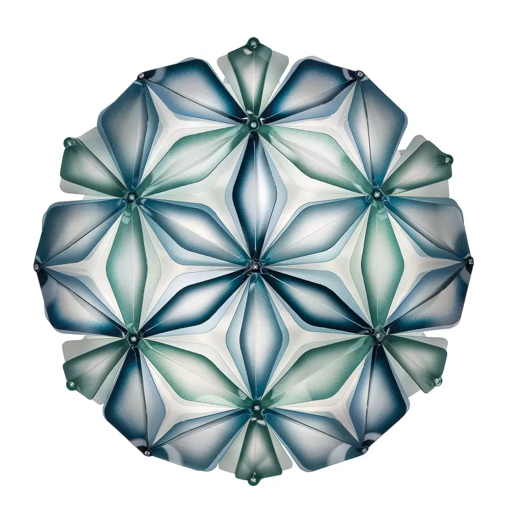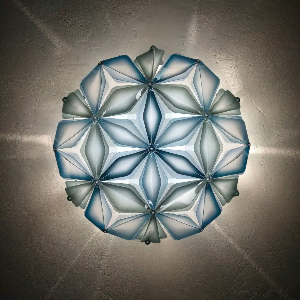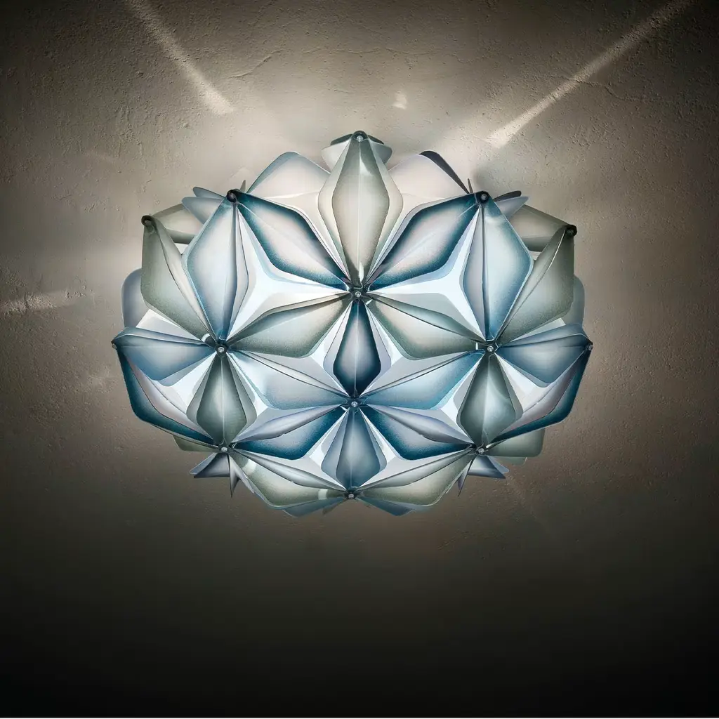 Inspired by the Flower of Life, a symbol of Sacred Geometry which maintains that all life is part of a divine, geometric plan, this ceiling lamp creates a powerful aesthetic impact while providing diffused, ambient lighting. The flush-mount diffuser is crafted of Slamp's patented material Opalflex®, an innovative, recyclable material composed of techno-polymers and glass crystals that is luminous like glass and resistant like plastic. Available in 5 vibrant colors, this version showcases gradients of blue added through silk-screen printing. Requires two E27 max 12W LED (not included).