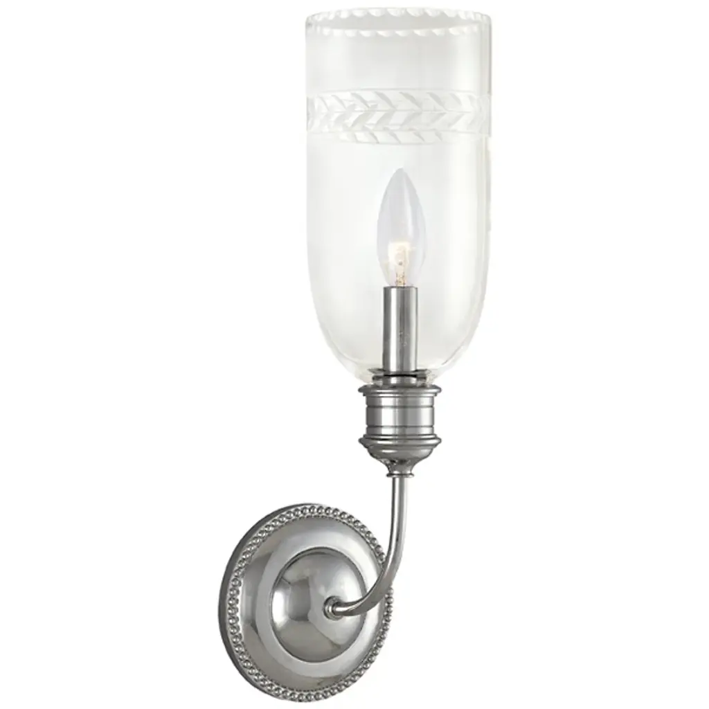 Colonial styling with Cast Metal details. Look to the Lafayette Wall Sconce by Hudson Valley Lighting to brighten your foyer, hallway, dining room or living room. Nodding to colonial style and its universal appeal, the design features a unique Cast Metal wall plate with beaded details. A thin arm reaches upwards holding the single candelabra light. Inspired by Colonial-style hurricane lamps with scalloped glass tops, the design showcases a tall Glass shade with scalloped edges and an etched leaf pattern.