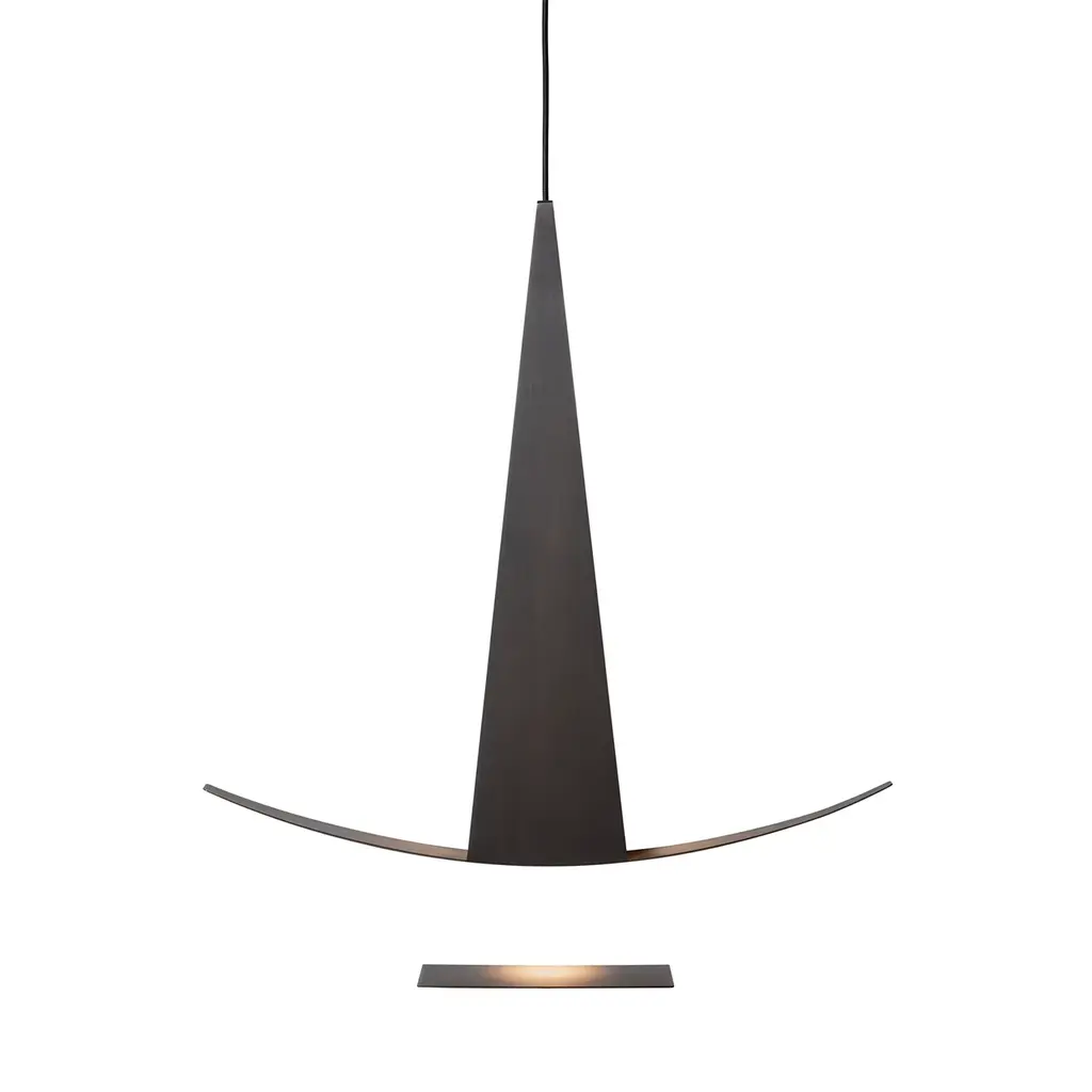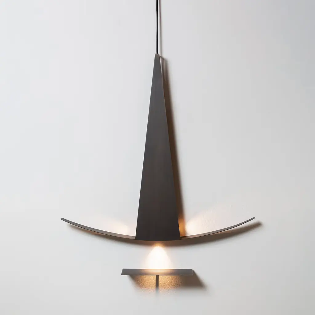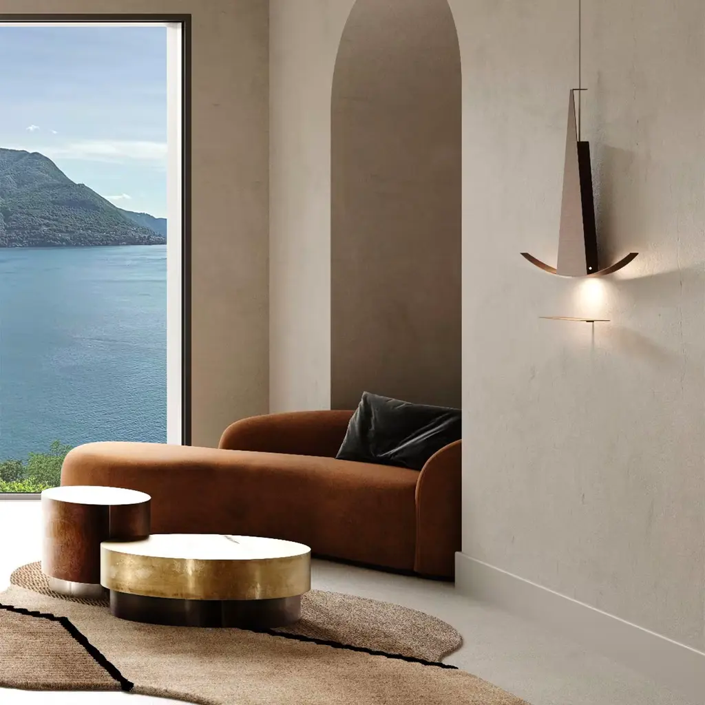 A striking testament to the contemporary connection between art and design, this sconce is an exclusive piece by architect Isacco Brioschi. Deftly handcrafted of brass and enriched with wood, it draws inspiration from sailing boats, merging rigid geometric lines with soft curves, complemented with a small brass shelf to place below.