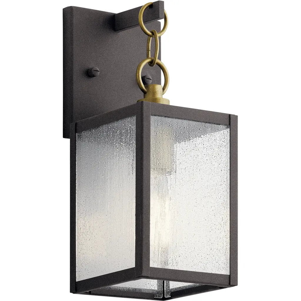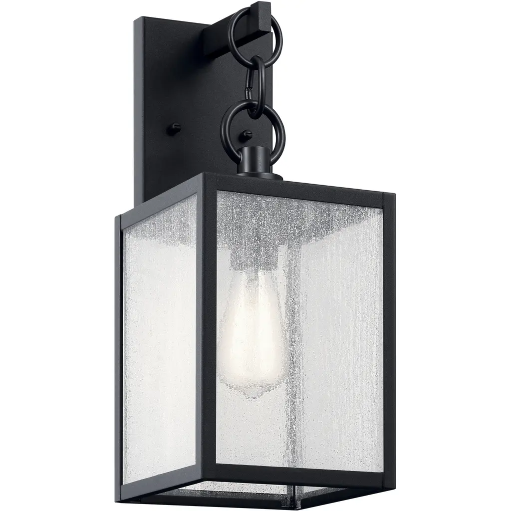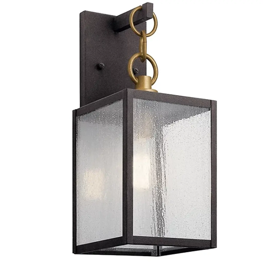 Update your exteriors with the modern touch of the Lahden Outdoor Wall Sconce by Kichler. A simple box-shaped shade utilizes a clear seeded glass and slender metal framework to enclose its incandescent light source. A contrasting oversized chain link detail connects the piece to its rectangular wall mount and brings a chic touch of style to the home. Its warm light brightens its environment with ease, making it the perfect piece for welcoming guests to the home.