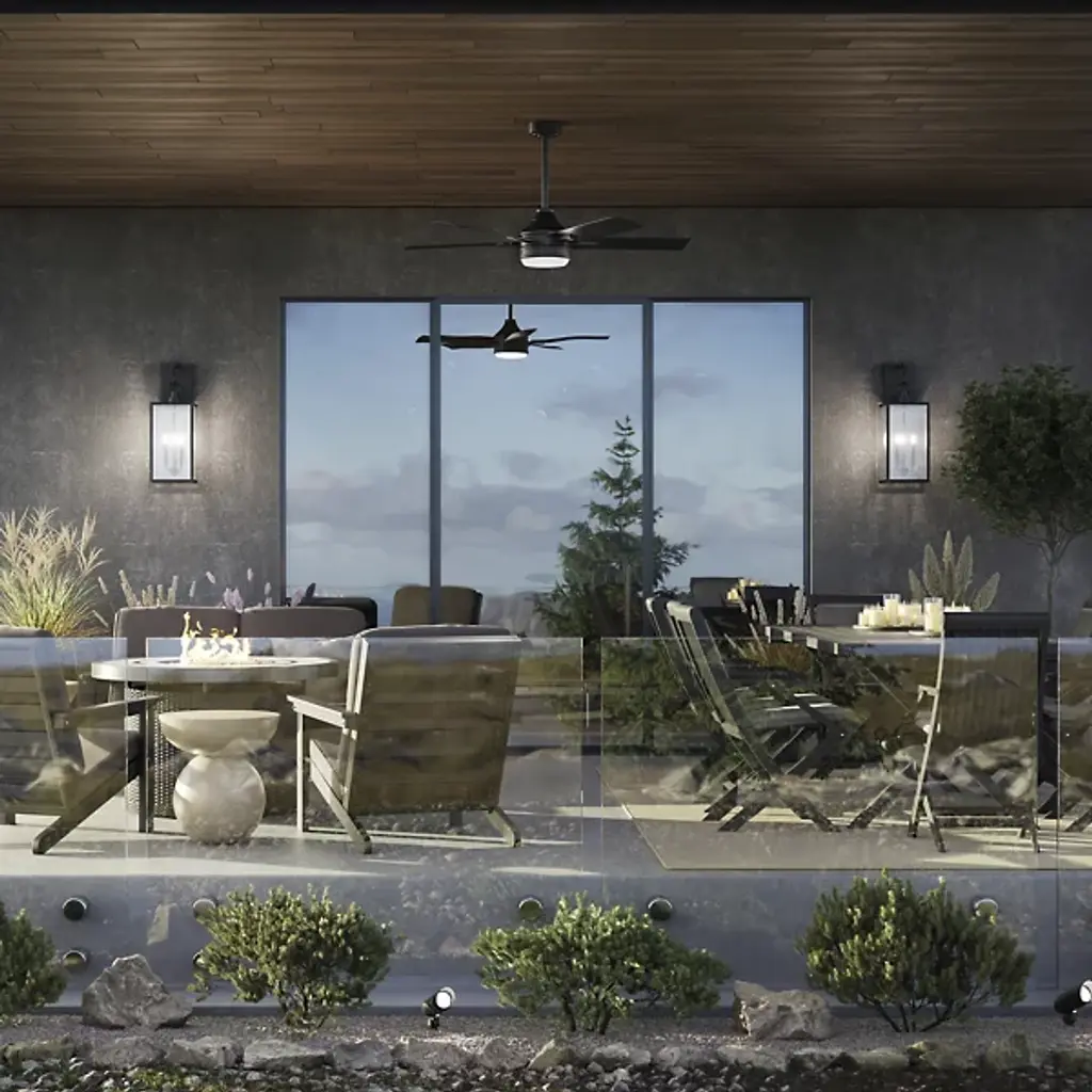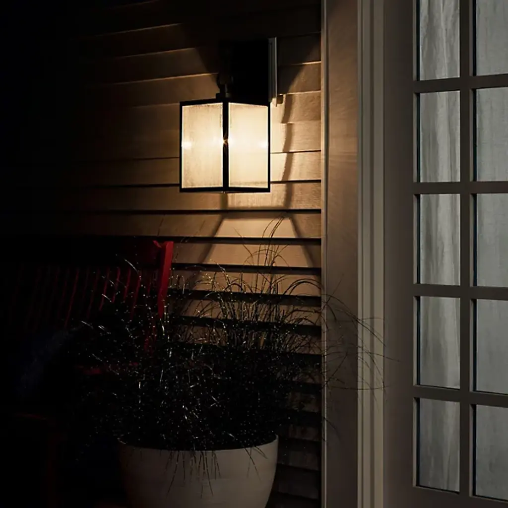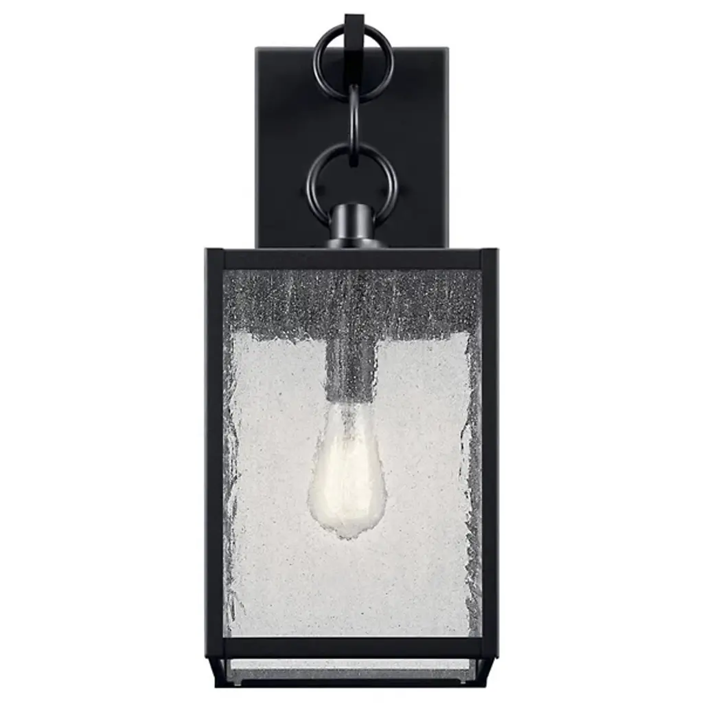 Update your exteriors with the modern touch of the Lahden Outdoor Wall Sconce by Kichler. A simple box-shaped shade utilizes a clear seeded glass and slender metal framework to enclose its incandescent light source. A contrasting oversized chain link detail connects the piece to its rectangular wall mount and brings a chic touch of style to the home. Its warm light brightens its environment with ease, making it the perfect piece for welcoming guests to the home.
