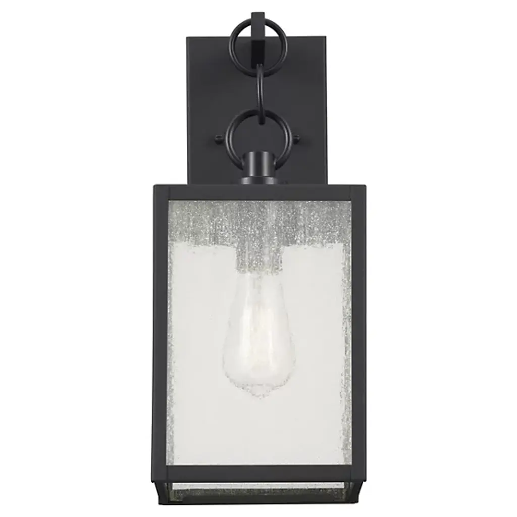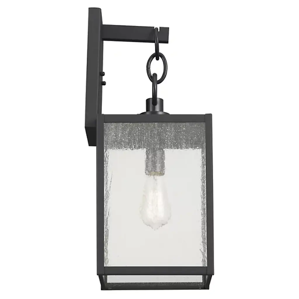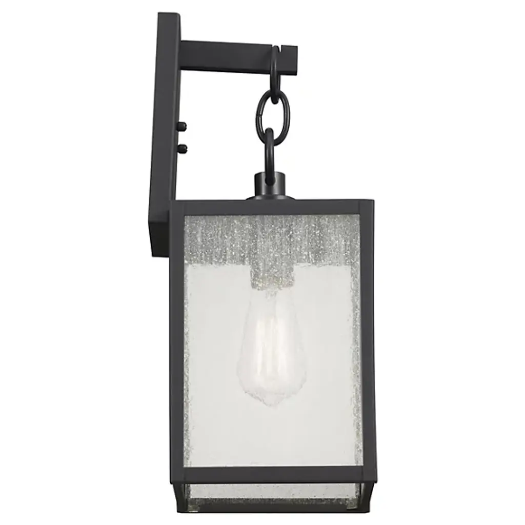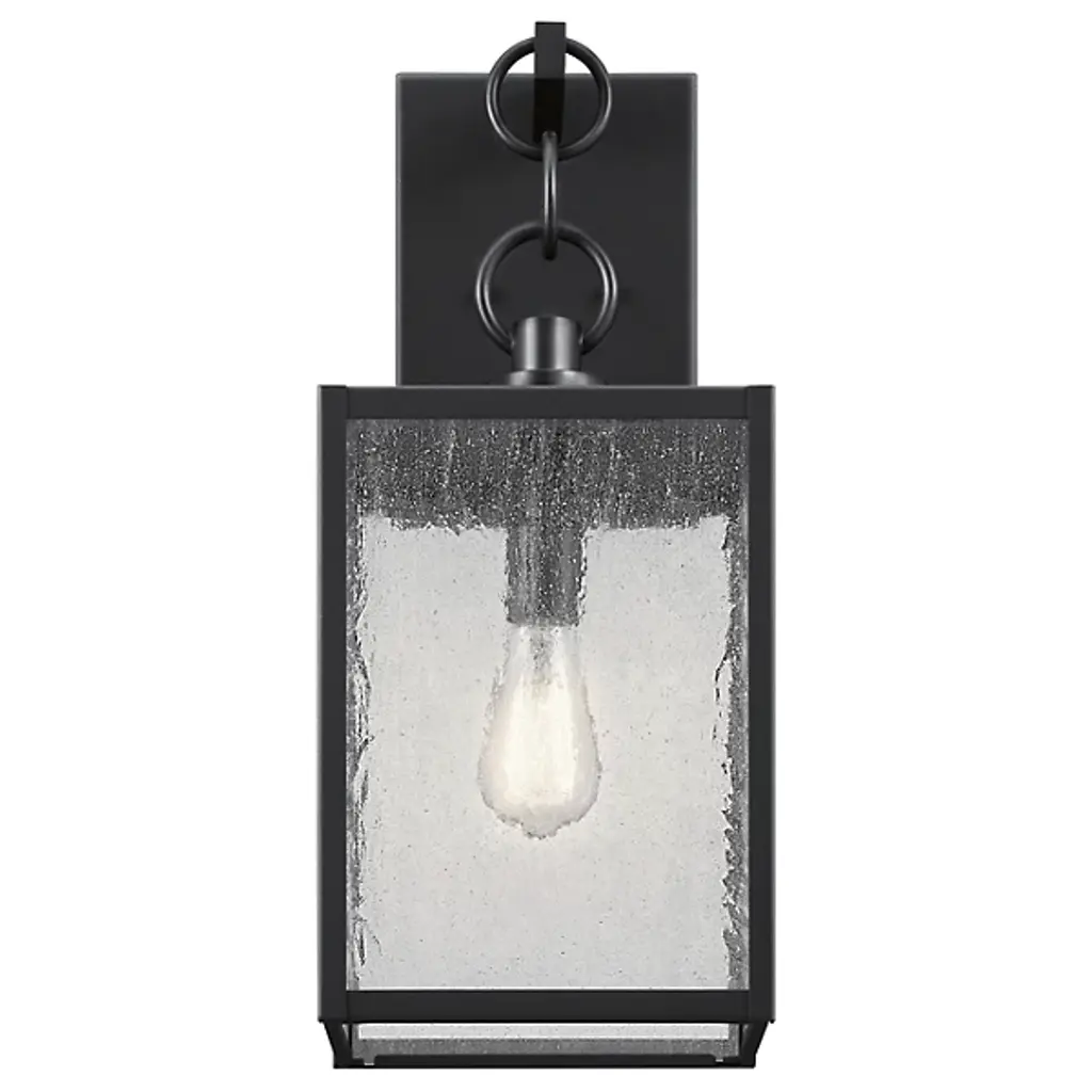 Update your exteriors with the modern touch of the Lahden Outdoor Wall Sconce by Kichler. A simple box-shaped shade utilizes a clear seeded glass and slender metal framework to enclose its incandescent light source. A contrasting oversized chain link detail connects the piece to its rectangular wall mount and brings a chic touch of style to the home. Its warm light brightens its environment with ease, making it the perfect piece for welcoming guests to the home.