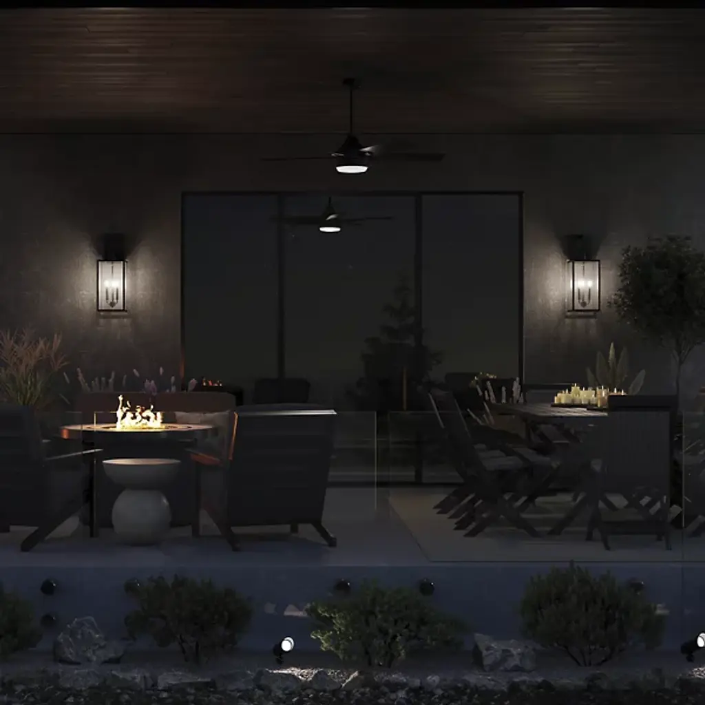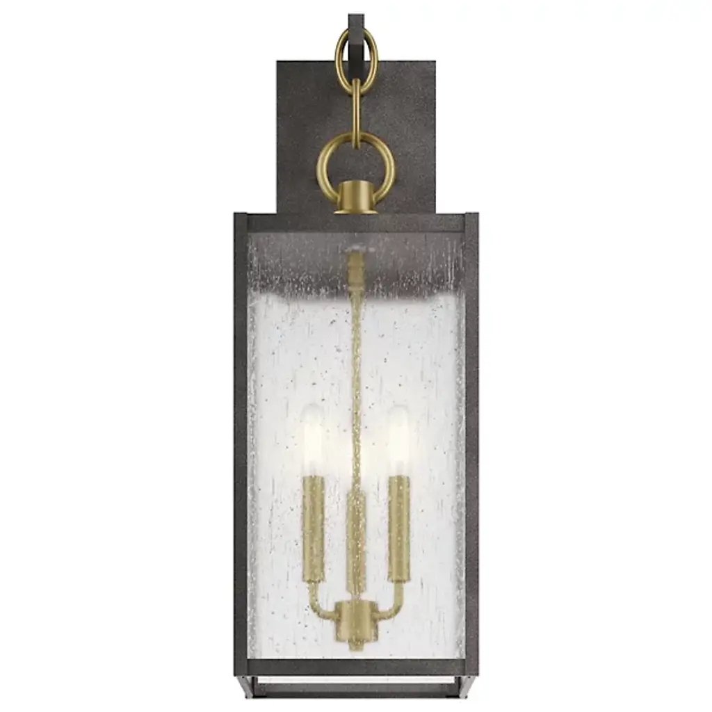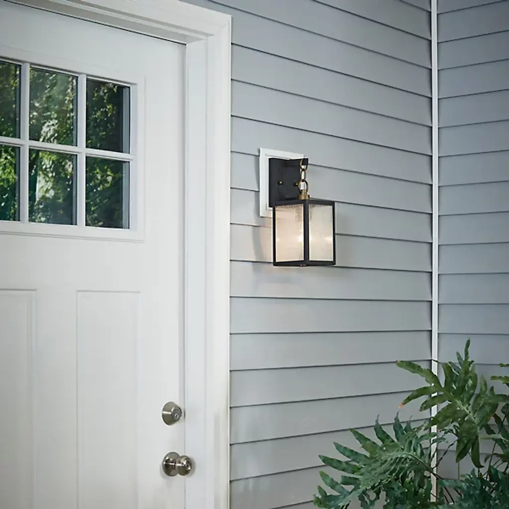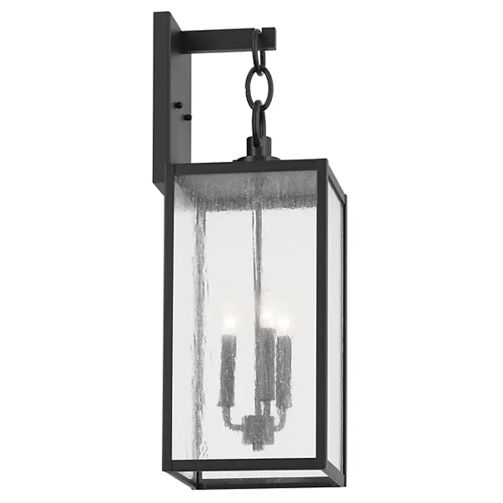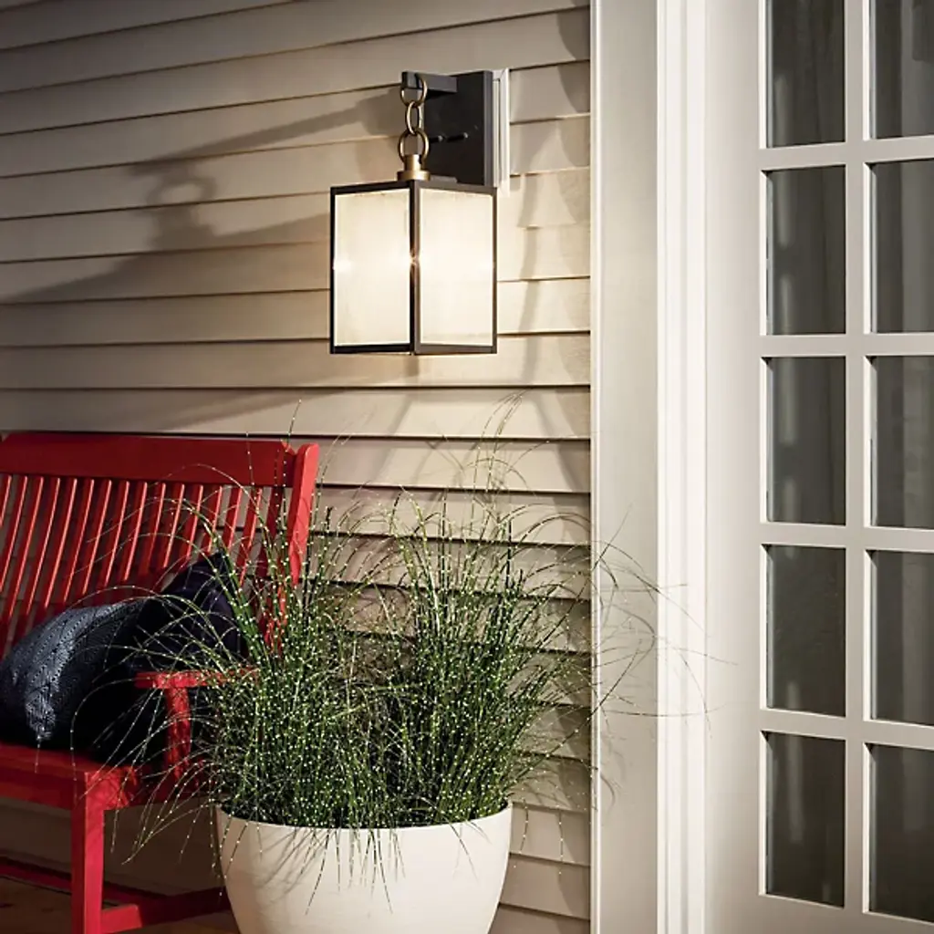 Update your exteriors with the modern touch of the Lahden Outdoor Wall Sconce by Kichler. A simple box-shaped shade utilizes a clear seeded glass and slender metal framework to enclose its incandescent light source. A contrasting oversized chain link detail connects the piece to its rectangular wall mount and brings a chic touch of style to the home. Its warm light brightens its environment with ease, making it the perfect piece for welcoming guests to the home.