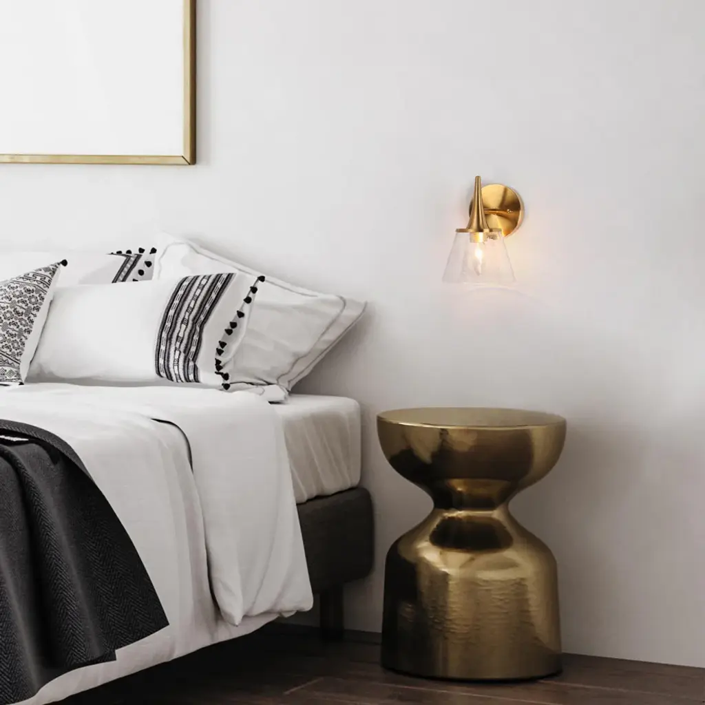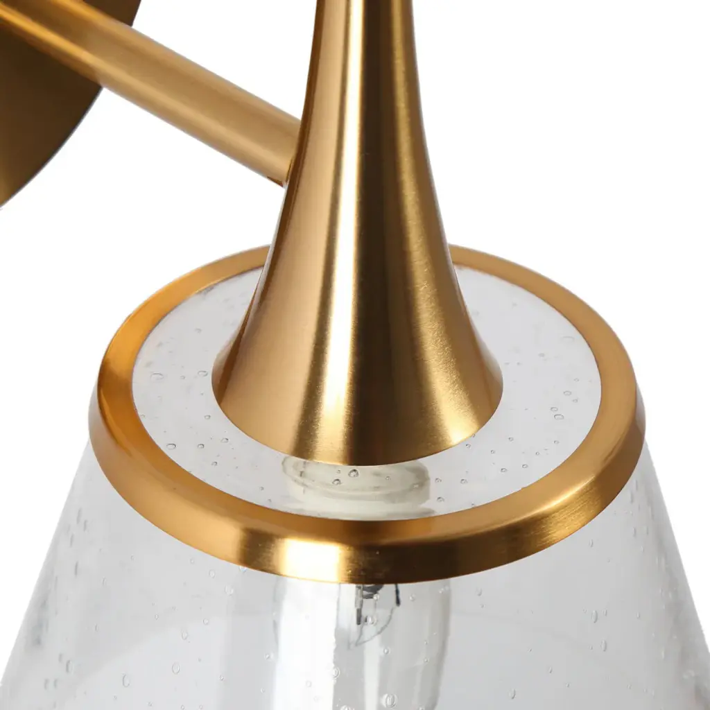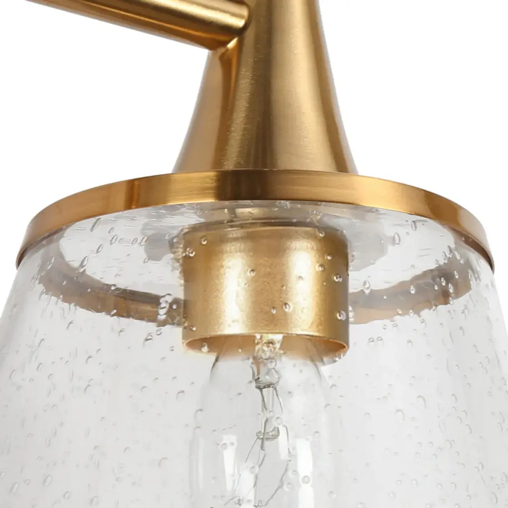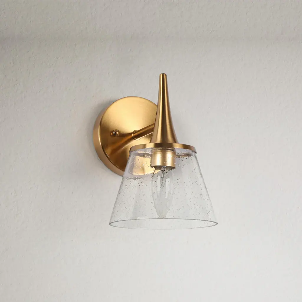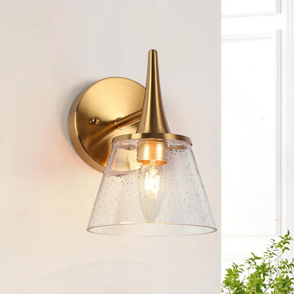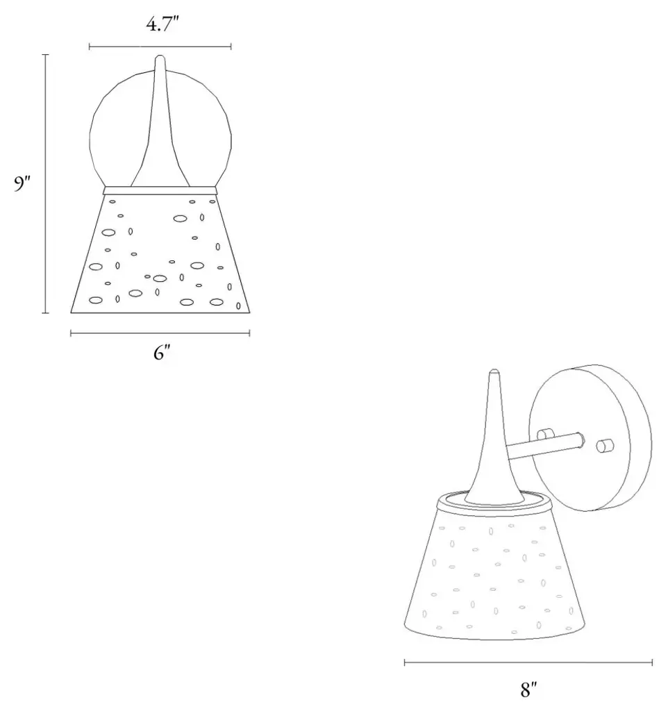 This modern wall light features elegant brushed gold hardware with bell-shaped shades and bubble texture add warmth and interest to any space. Size: L 5.9"• W 7.9"• H 9"Material: Iron+GlassFinish: GoldUL Safety Rated: DampBulb: E12, Max 40W (Bulb not included)Voltage: 120 VoltsLights Qty: 1Dimmable: Yes (Compatible with dimmer switch/ bulb)Warranty: 2 years (Accessories Free Replacement)
