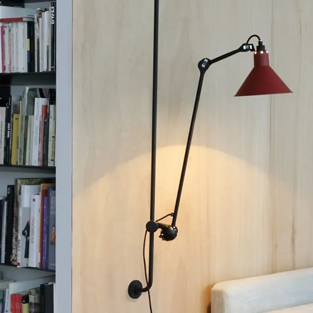 Appealing and adjustable, the Lampe Gras 214 Wall Sconce from DCW editions brings a simple, smooth-surfaced piece perfectly refined for modern or contemporary spaces. First designed in 1921 by Bernard-Albin Gras, this piece uses a vertical bar held between two disc mounts to hold an adjustable hub and two articulated arms out from the wall. The bar acts as a track allowing the steel arms and single socket lamp to raise and lower as desired, while the arms themselves lack screws and welded joints, giving the piece a graceful, flowing presence as it lights up its surroundings.
