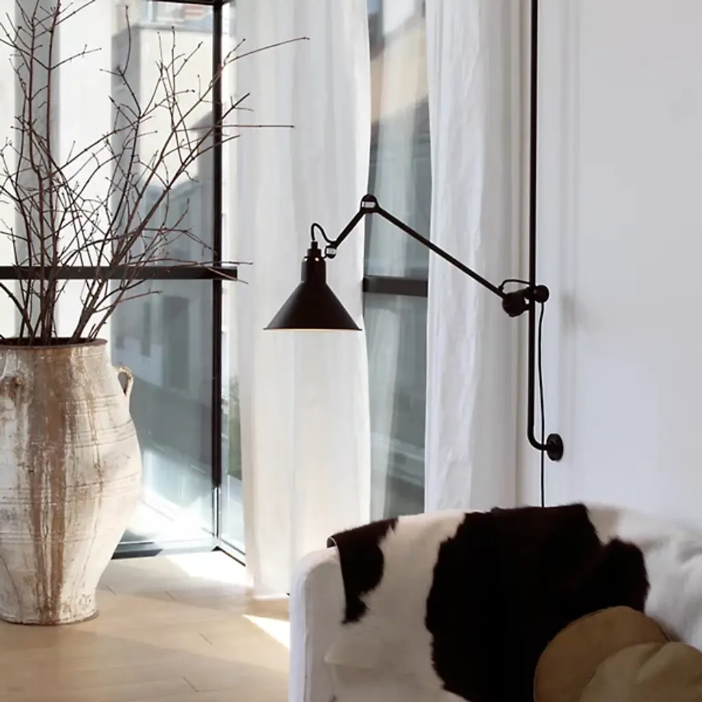 Appealing and adjustable, the Lampe Gras 214 Wall Sconce from DCW editions brings a simple, smooth-surfaced piece perfectly refined for modern or contemporary spaces. First designed in 1921 by Bernard-Albin Gras, this piece uses a vertical bar held between two disc mounts to hold an adjustable hub and two articulated arms out from the wall. The bar acts as a track allowing the steel arms and single socket lamp to raise and lower as desired, while the arms themselves lack screws and welded joints, giving the piece a graceful, flowing presence as it lights up its surroundings.