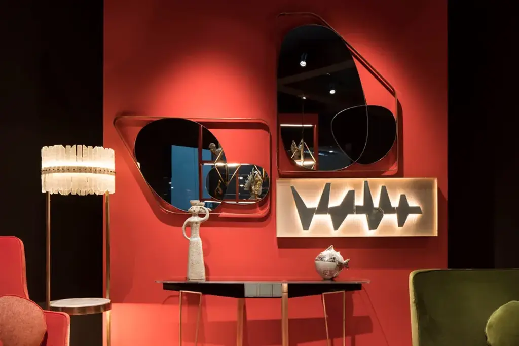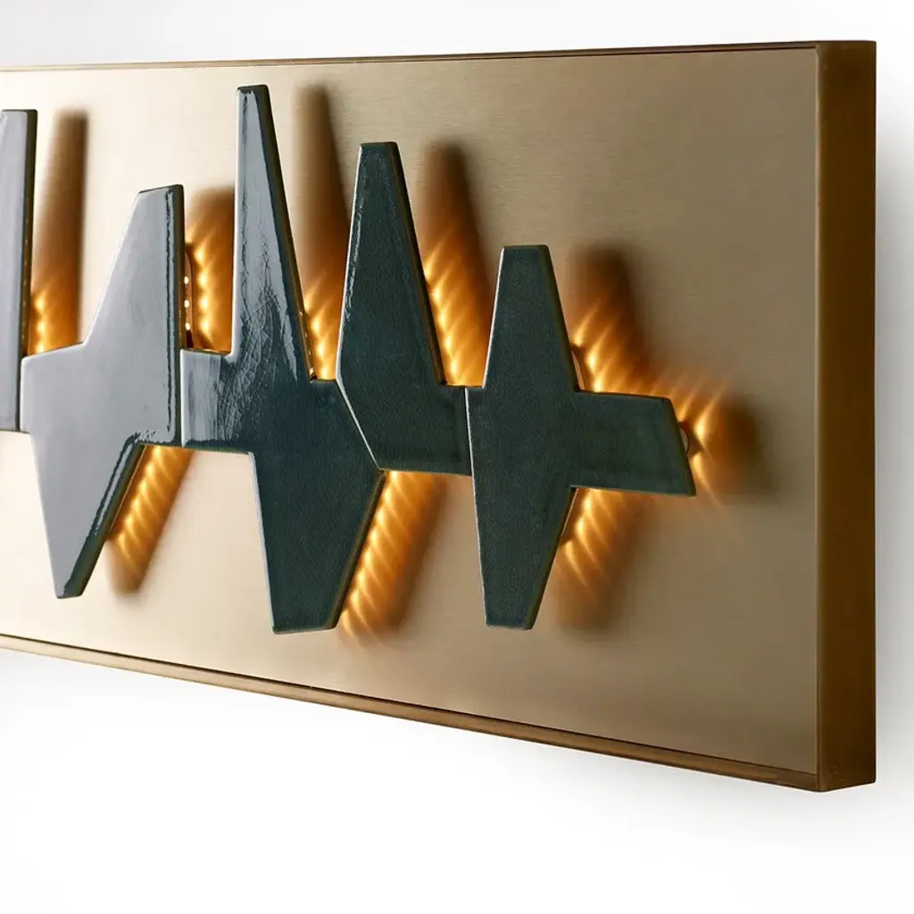 Landscape wall lamp composed by a brass panel with a stripled backlit ceramic bas-reliefs.