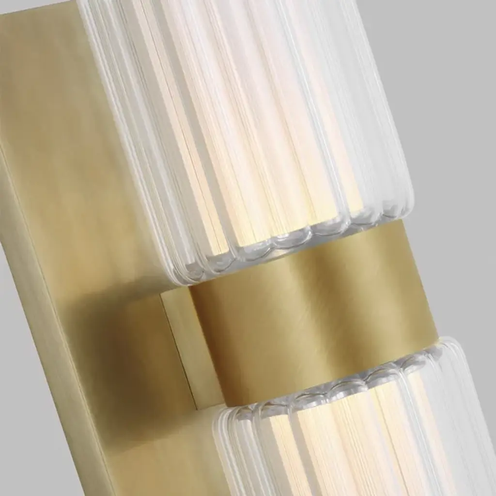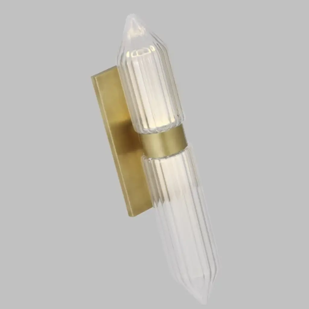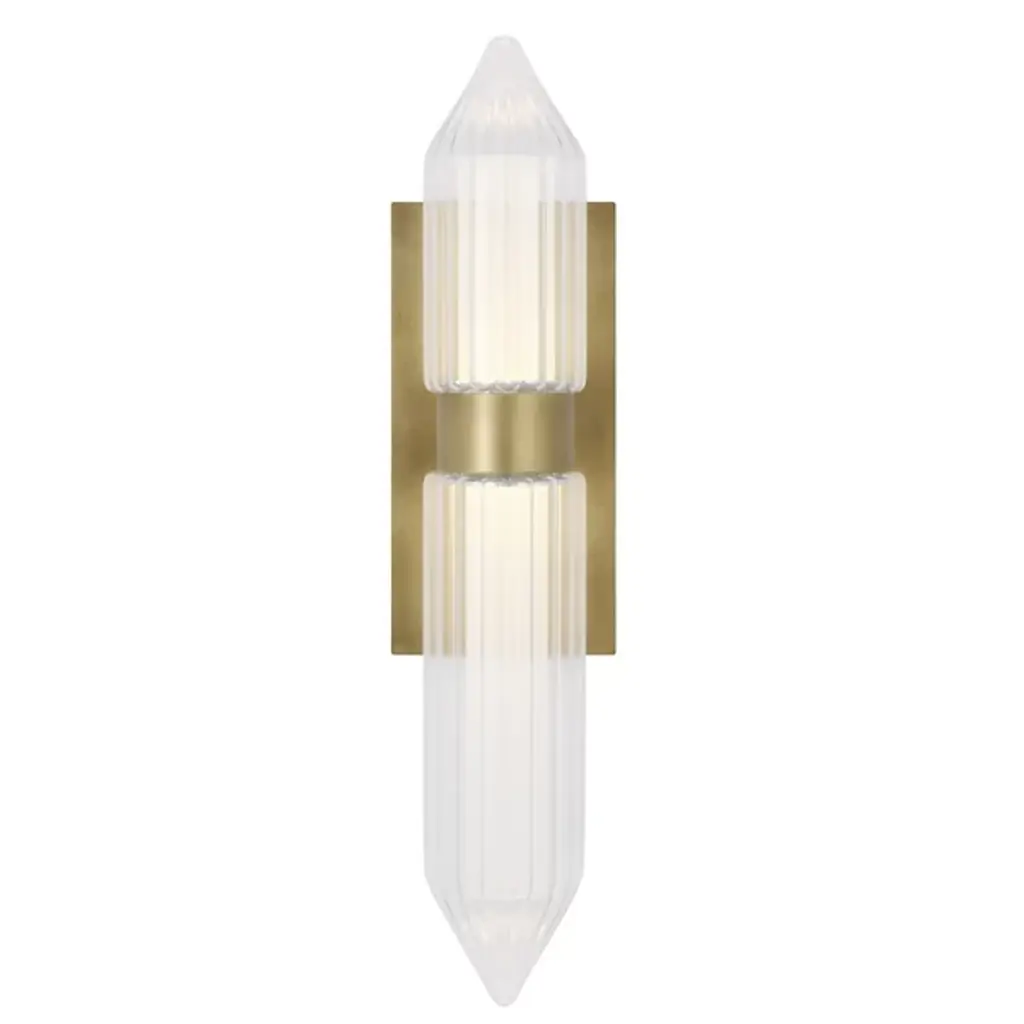 The Langston LED Wall Sconce by AvroKO has an elegant air as a hand-formed, fluted glass shade shaped like a crystal is suspended by a sleek, beautifully finished metal band and matching backplate. The interior of this geometric shade features laser-etched tubing that helps to evenly diffuse a layer of energy-efficient light throughout its form, bringing a welcoming glow to surroundings. Minimal and modern, this structural wall sconce has an elevated feel that artfully balances form with function.