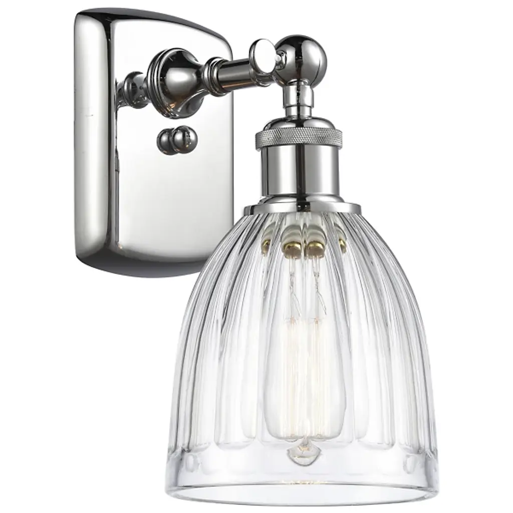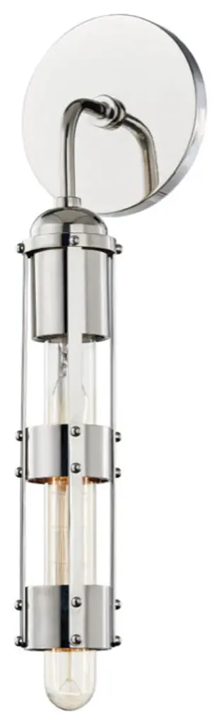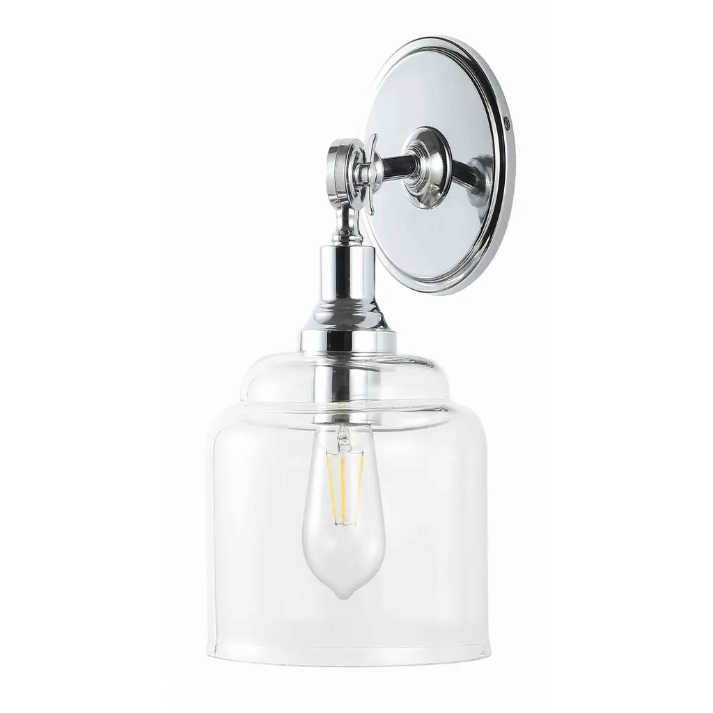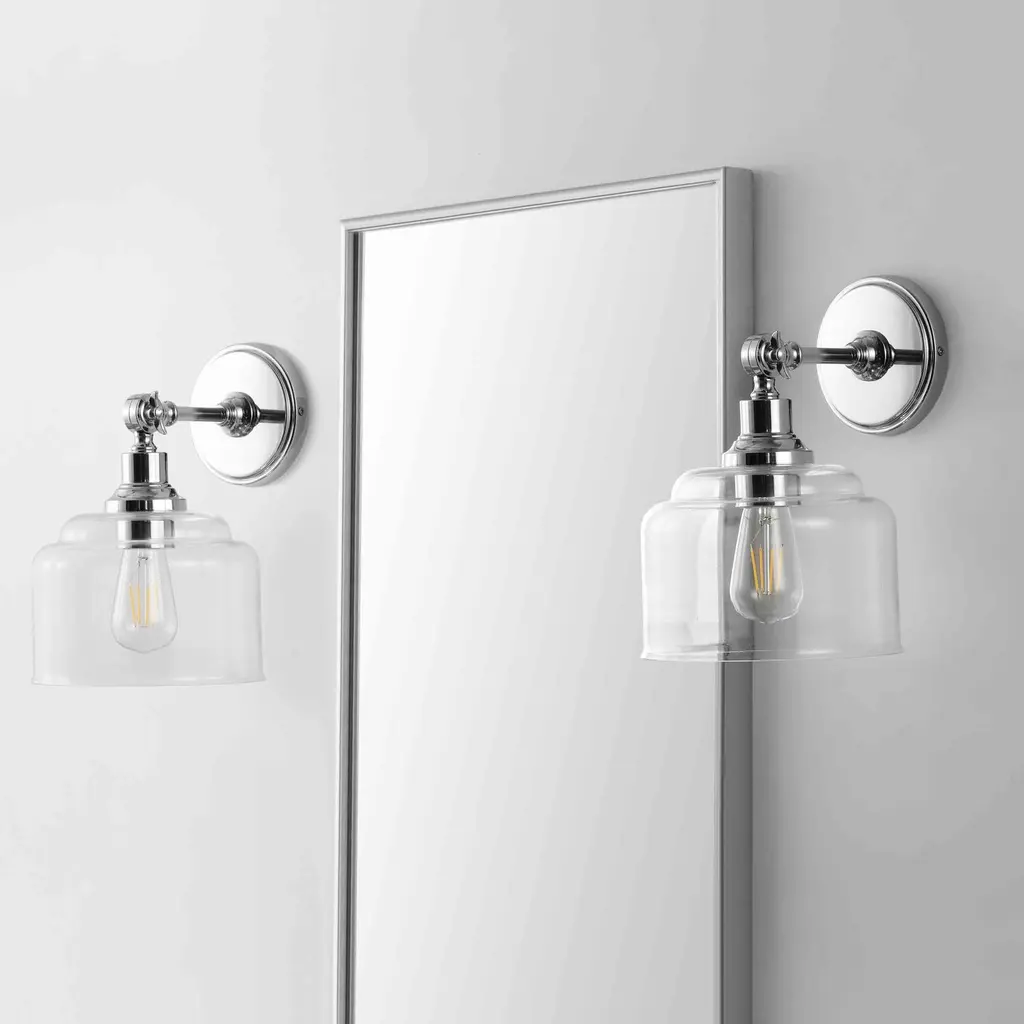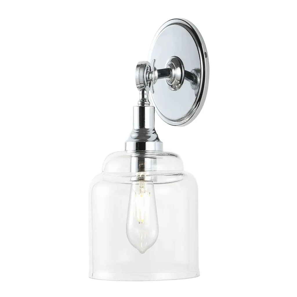 A bell-shaped glass shade gives the Lansor wall sconce its wealth of sculptural intrigue. Set on a sleek chrome base, this space-saving wall lamp from Safavieh is definitively modern. This sconce features an exposed bulb showcased in an adjustable clear glass shade for a hint of industrial style.