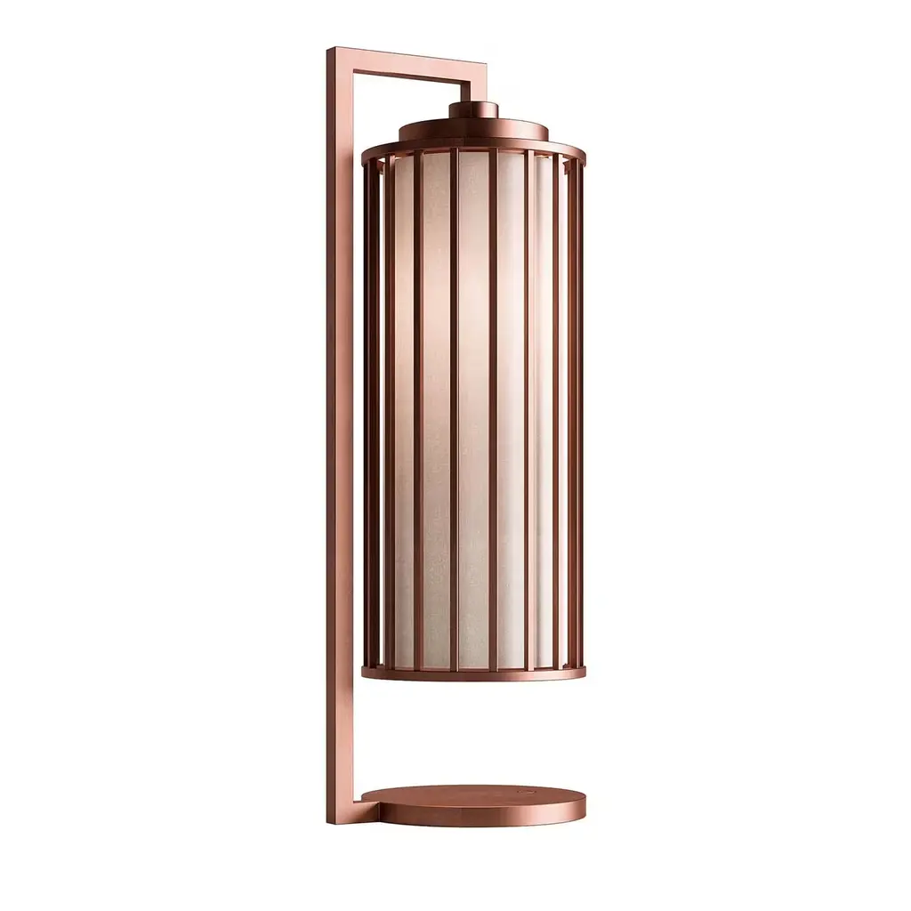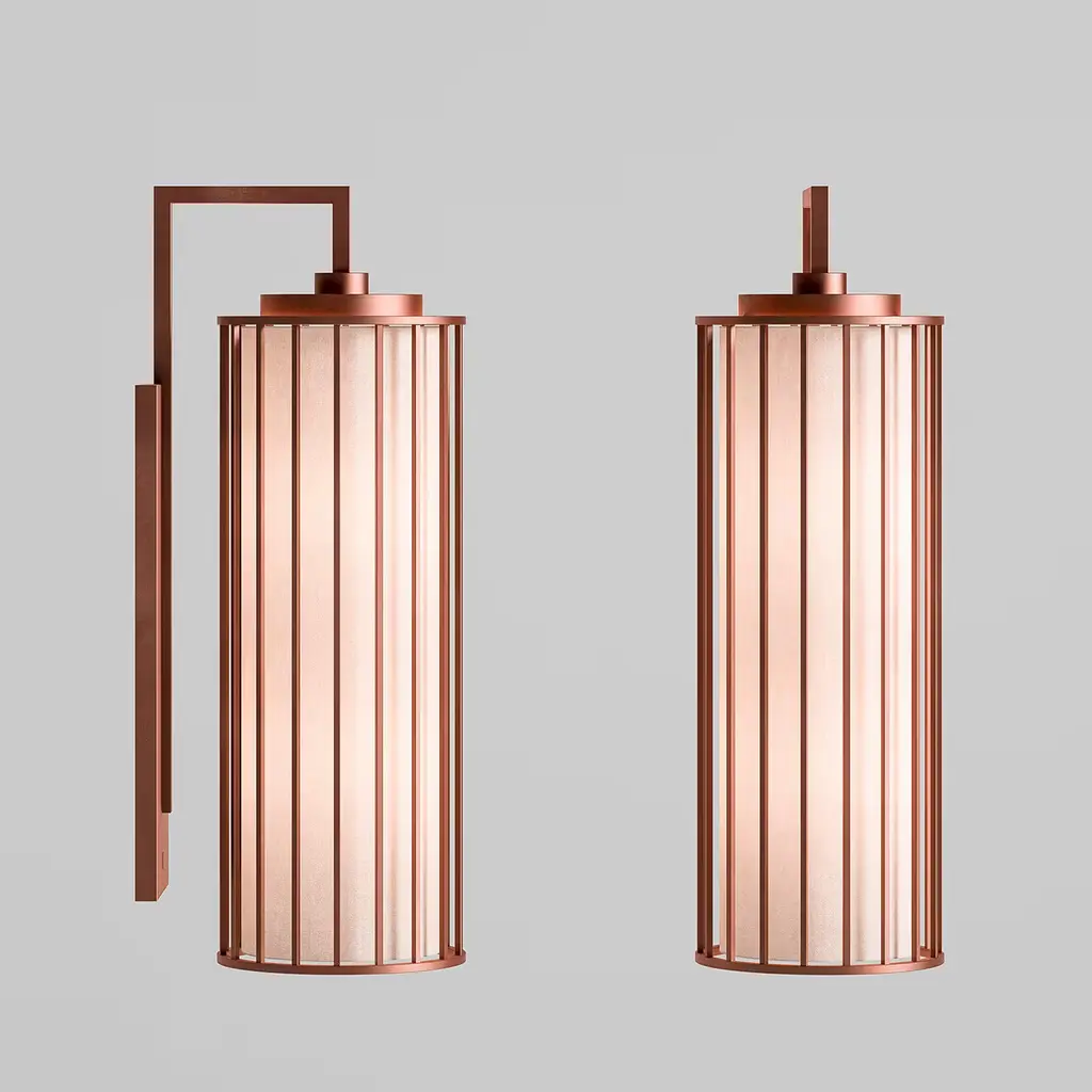 The unique aesthetic and subtle complexity of this singular sconce make it an exceptional statement piece for any modern or mid-century decor. Mounted on the wall with a slender rectangular metal plate, this exquisite lantern hangs from an angled arm with a cage-style cylindrical frame with a brushed-copper finish that contains the ivory fabric shade. Arranged in multiples along an entryway or flanking a console or bed frame, this light fixture will create a captivating ambiance, radiating warmth into any interior.