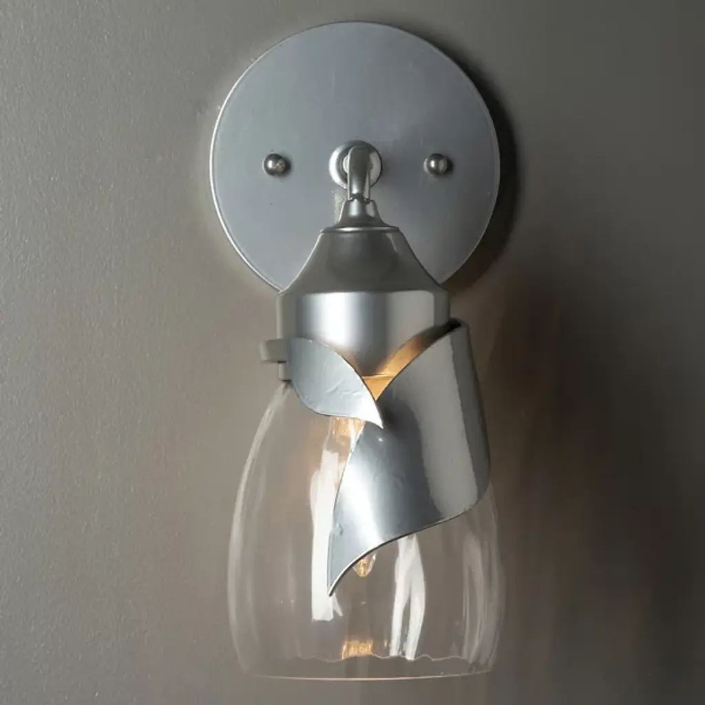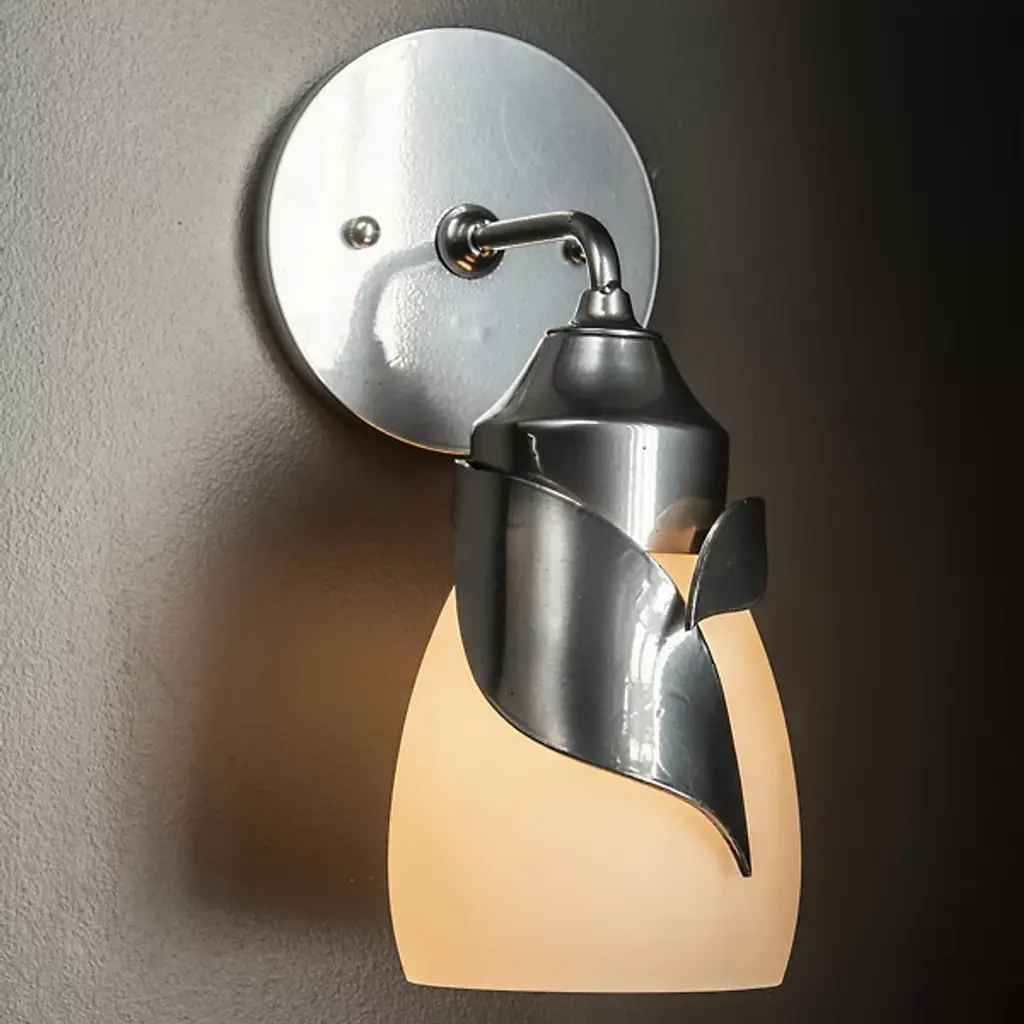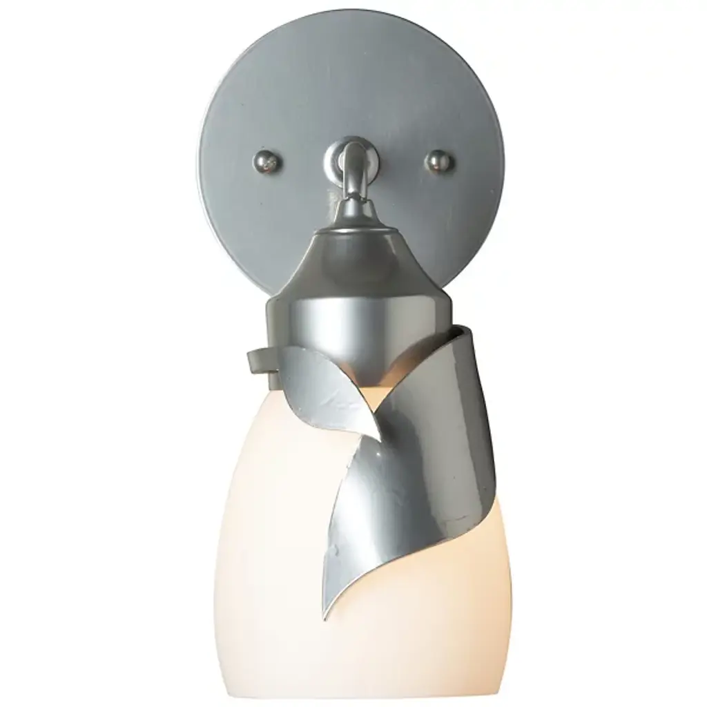Interject a little extra warm, ambient light throughout your home with the Lapas 1-Light Bathroom Wall Sconce by Hubbardton Forge. This wall sconce features a circular backplate and a minimal angled metal arm that connects to the single glass globe. Delicate metal ribbonry wraps around the top of the globe. Both sides of the ribbon are tapered to create a distinctive angle as it embraces the globe’s rose shape. Mount this refreshingly beautiful bathroom wall sconce upwards or downwards to create the directional light you need.