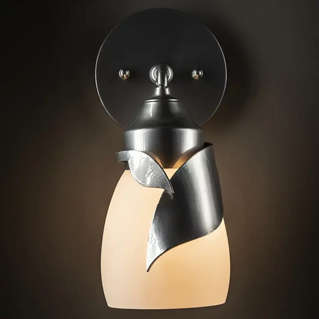 Interject a little extra warm, ambient light throughout your home with the Lapas 1-Light Bathroom Wall Sconce by Hubbardton Forge. This wall sconce features a circular backplate and a minimal angled metal arm that connects to the single glass globe. Delicate metal ribbonry wraps around the top of the globe. Both sides of the ribbon are tapered to create a distinctive angle as it embraces the globe’s rose shape. Mount this refreshingly beautiful bathroom wall sconce upwards or downwards to create the directional light you need.