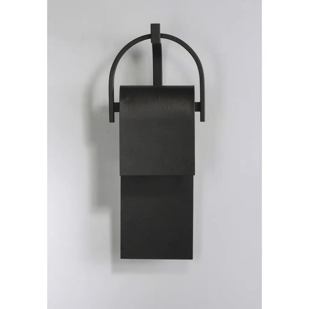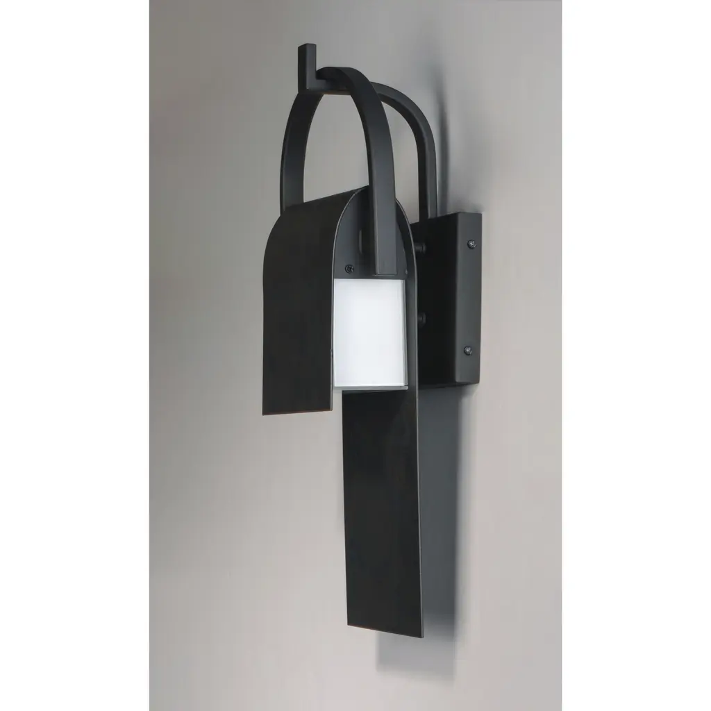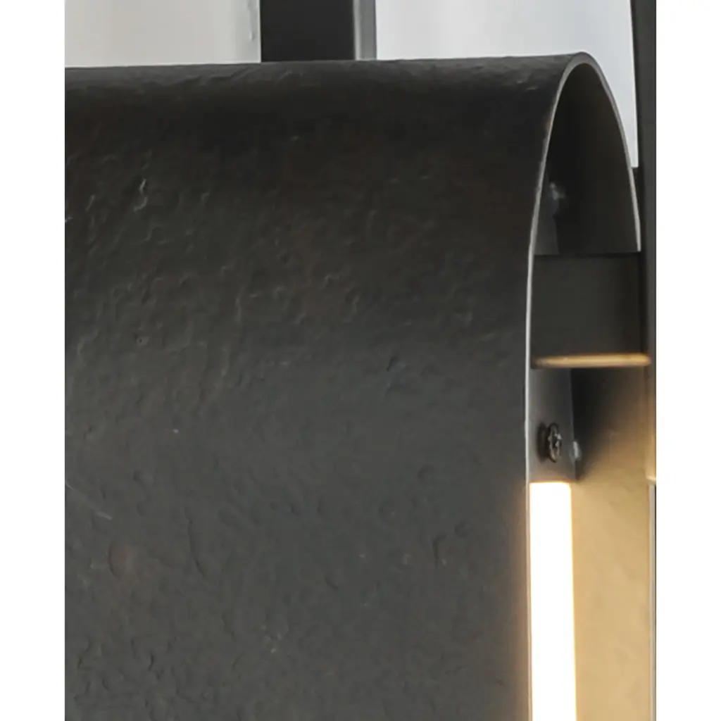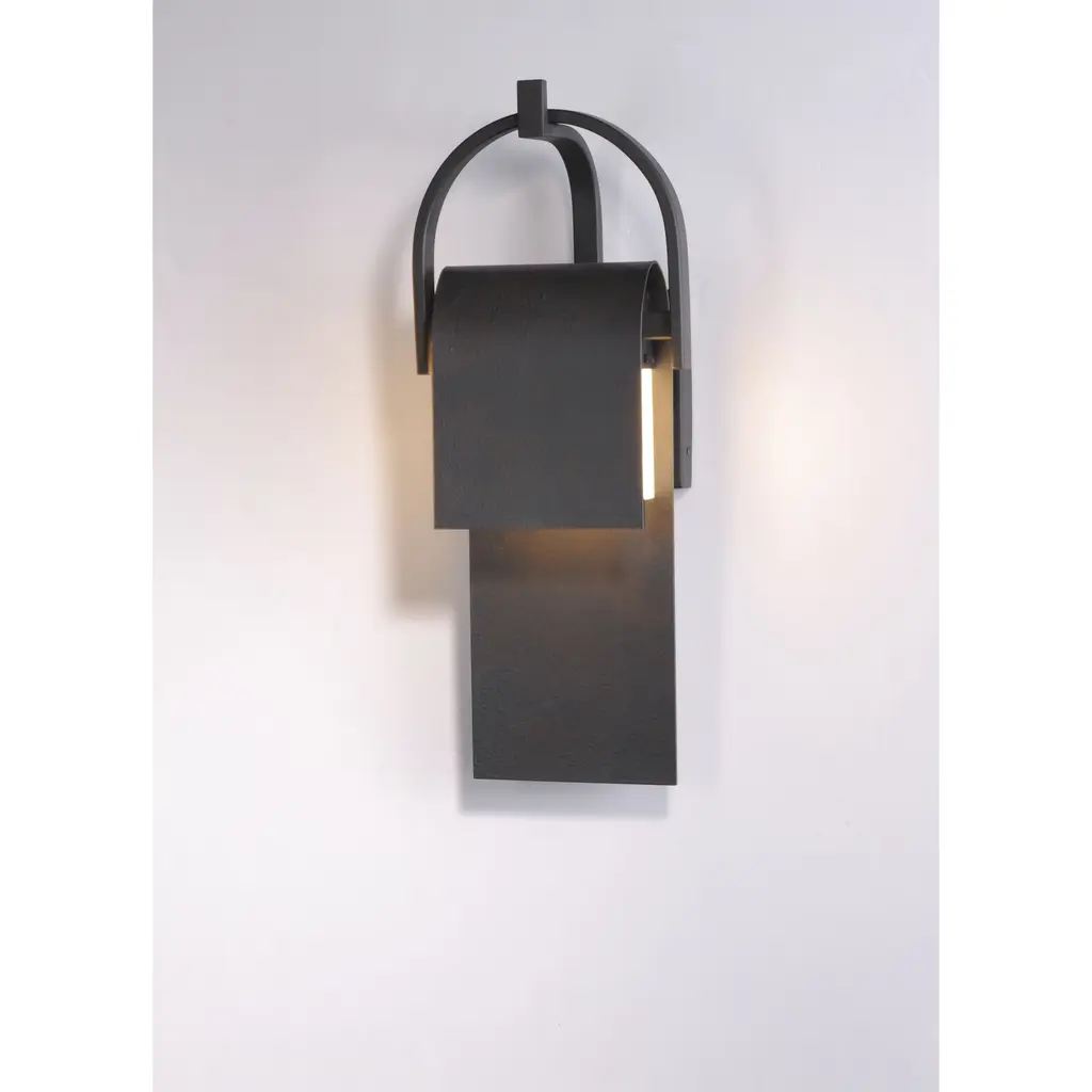 A panel of aluminum is bent forward at the top and cradled by a bracket. A beautiful textured Rustic Forged finish is used in keeping with the pastoral design elements. Cleverly concealed inside the arch is a LED light source which sheds ample light to the surface below without forward glare.