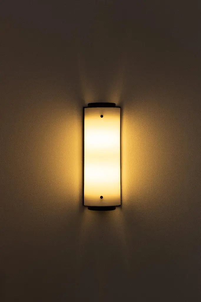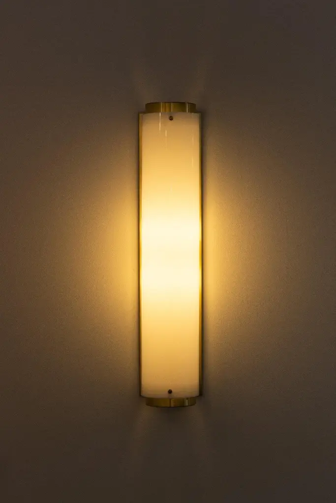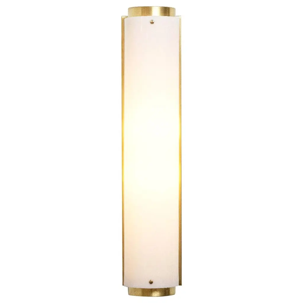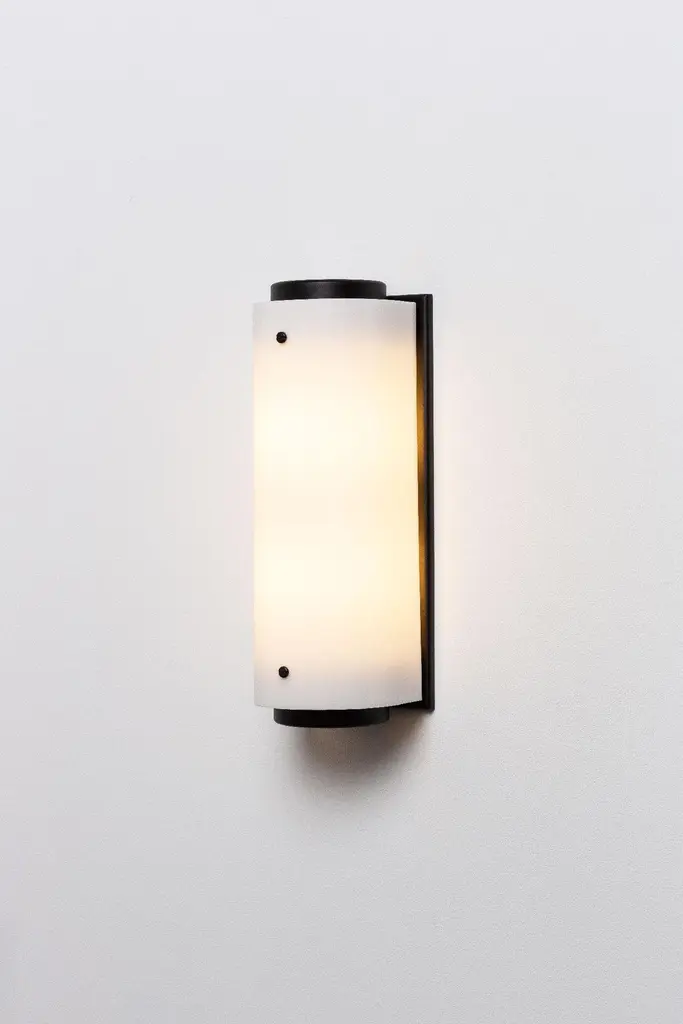 The arc sconce is made of a solid satin brass or black body and backplate with a white Lucite shade and brass screws. Measures: Large: W 5.25in (13.5cm) x D 5.25in (13.5cm) x H 24.5in (62cm)Small: W 5.25in (13.5cm) x D 5.25in (13.5cm) x H 12in (30.5cm)(2) 60W medium base socketRaw brass and white LuciteHandmade in LAUL listed / CE rated.