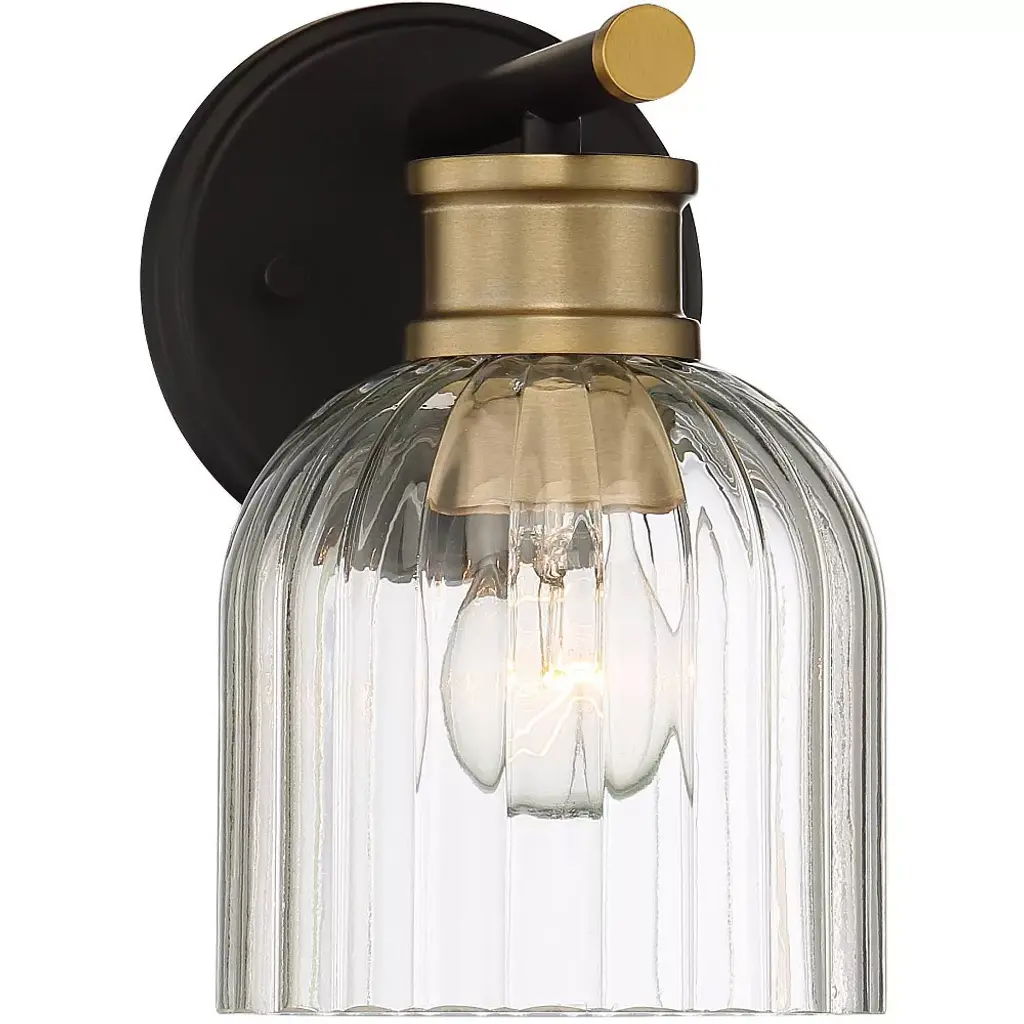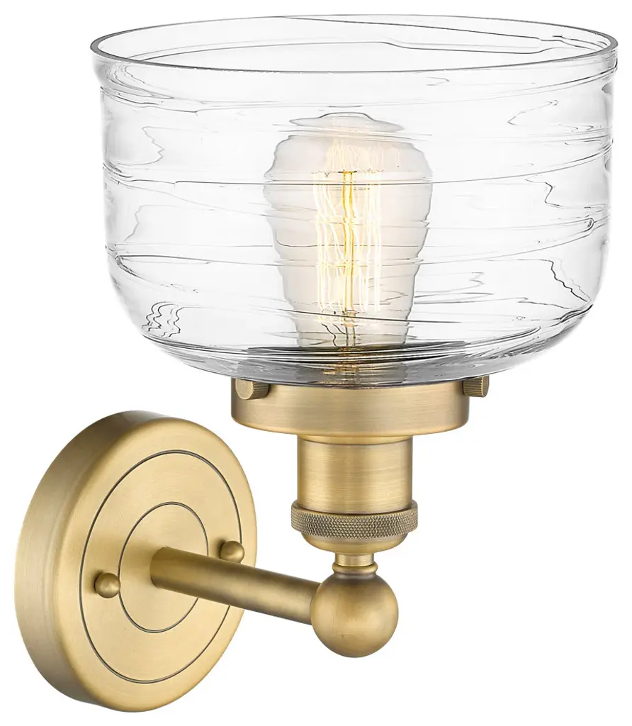 Large Bell 1-Light 7" Sconce, Brushed Brass Finish, Clear Deco Swirl Shade