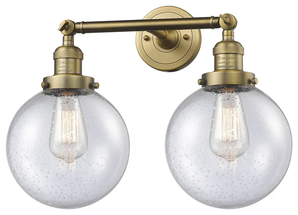 One of our largest and original collections, the Franklin Restoration is made up of a vast selection of heavy metal finishes and a large array of metal and glass shades that bring a touch of industrial into your home.Features:Solid brass 180 degree adjustable swivels with internal teeth that lock in at 5 degree intervalsFixture can be hung with bulbs facing up or down as a wall mount4.5 inch 2mm heavy cast backplateRated for 100 watt maximum per socketUL/CUL and ETL/CETL damp ratedCompatible with incandescent, LED, fluorescent and halogen bulbsNumber of Bulbs: 2Bulb Wattage: 60Bulb Type: IncandescentBulb Included: NoVoltage: 120Finish: Brushed Brass Finish Shade Finish: Seedy Shade.